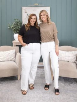 Brittany (short blonde hair) is 5’10, 36B bra, typically wears size S in tops and 3/5 in denim. Wearing size 3.