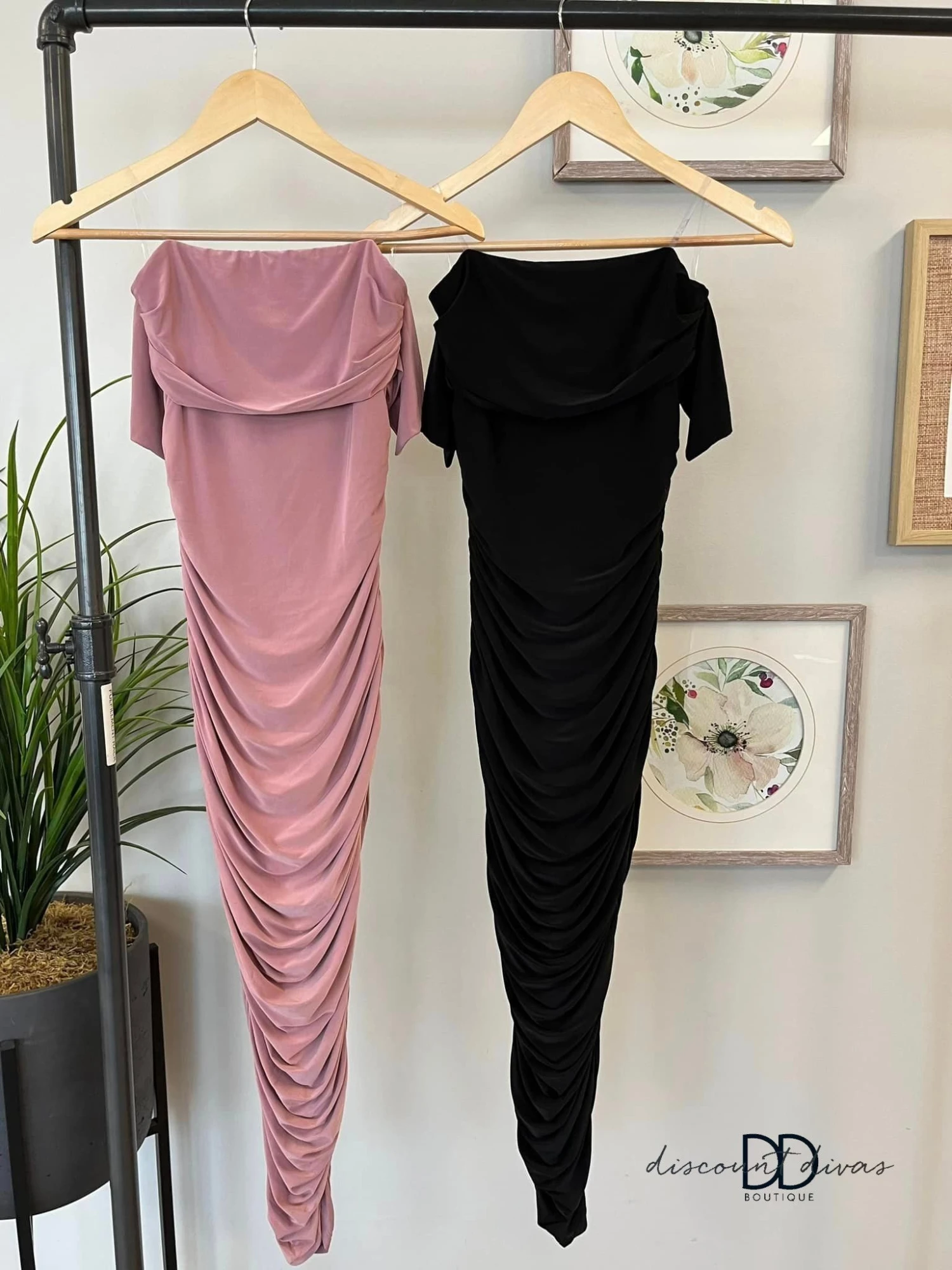 Features: solid print, ruched, off the shoulder, short sleeve, midi