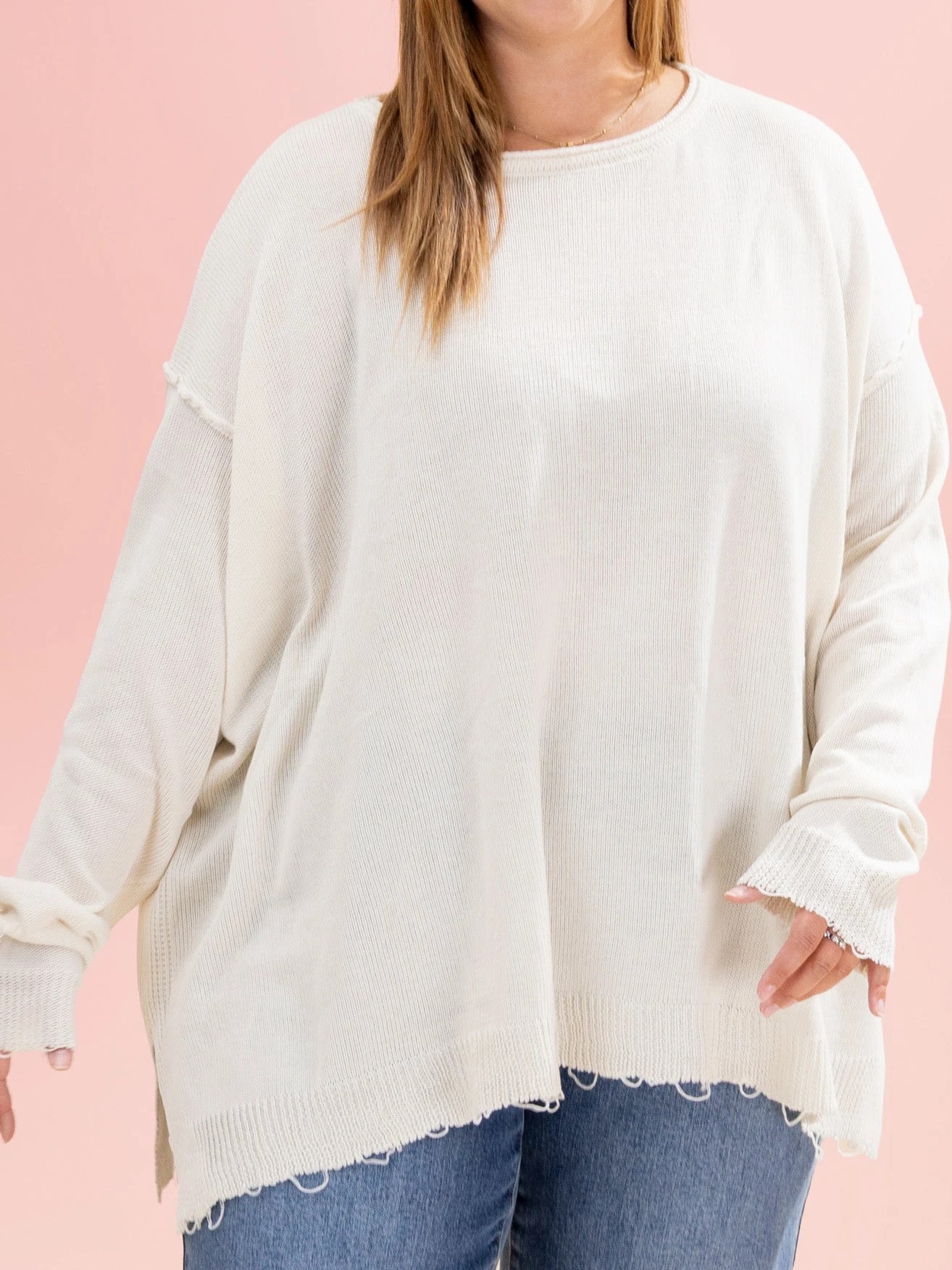 Features: Round Neck, Long Sleeves, Exposed Seam Detail, Side Slits, Boxy Hem, Oversized