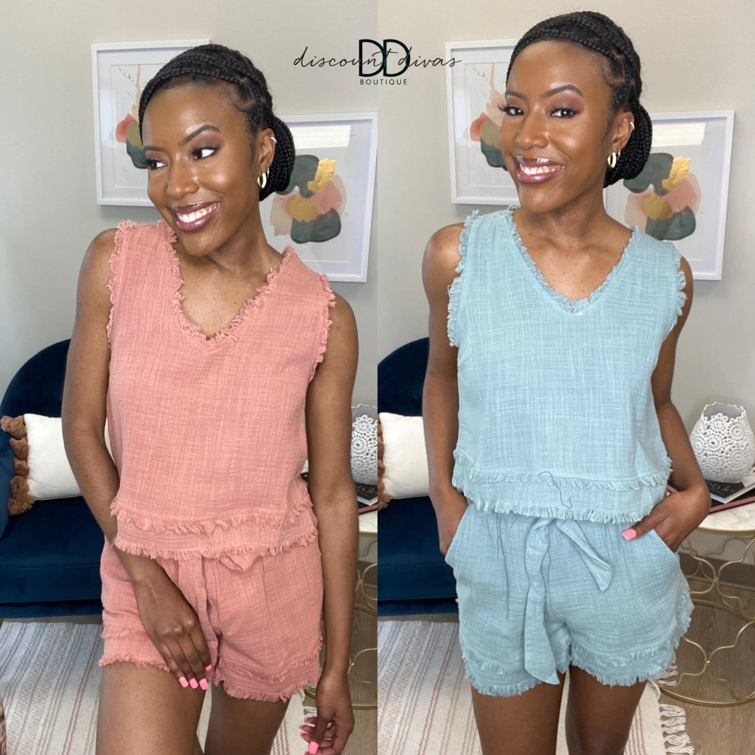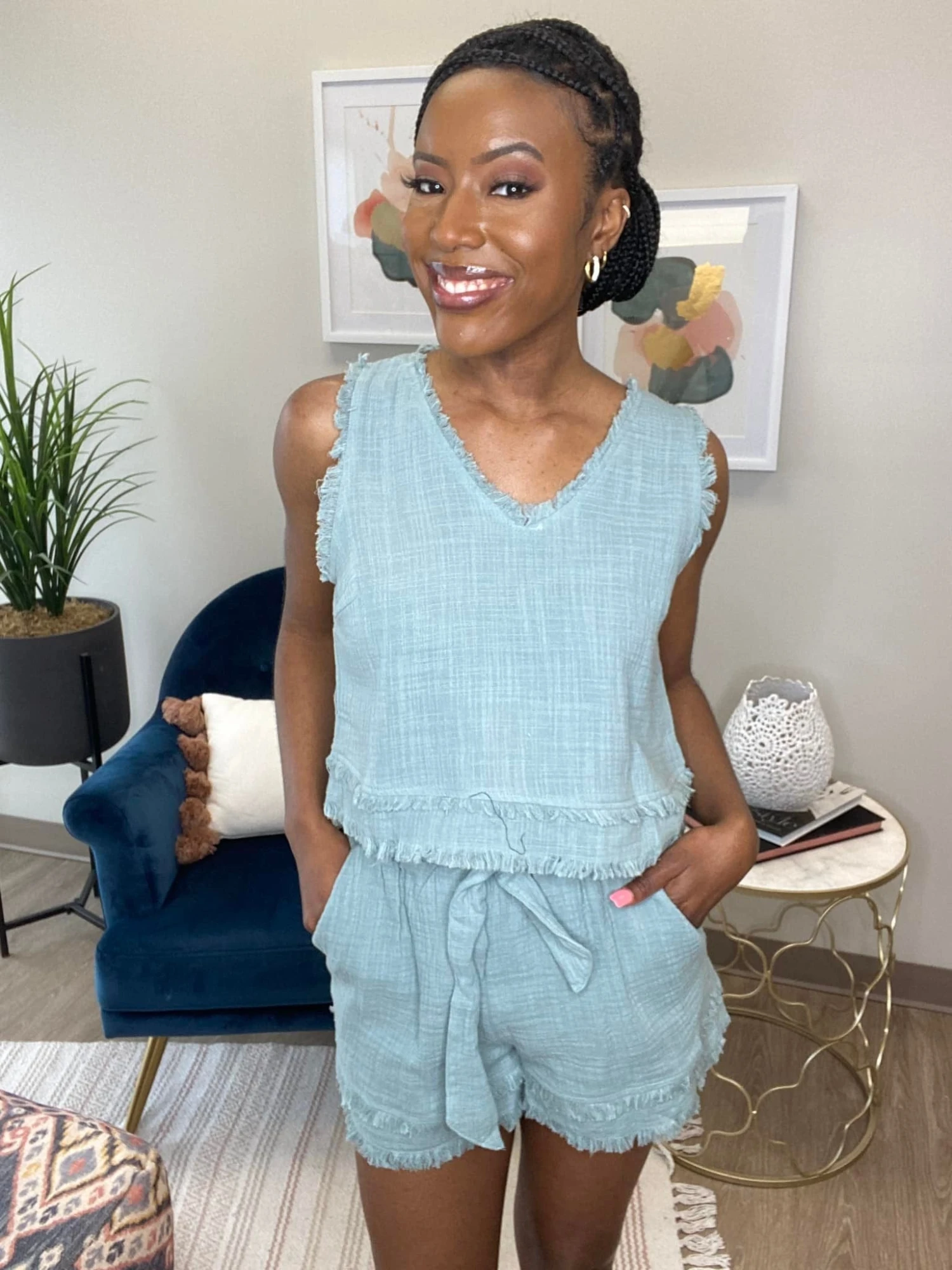 Features: (Top) v neck, sleeveless, raw hem (Bottom) side pockets, elastic waist with tie