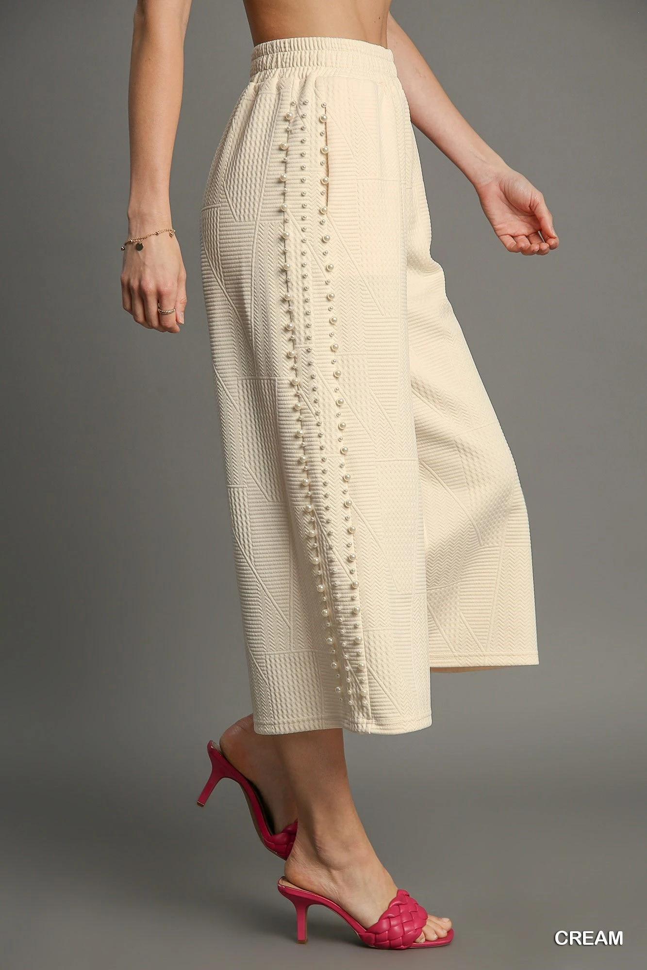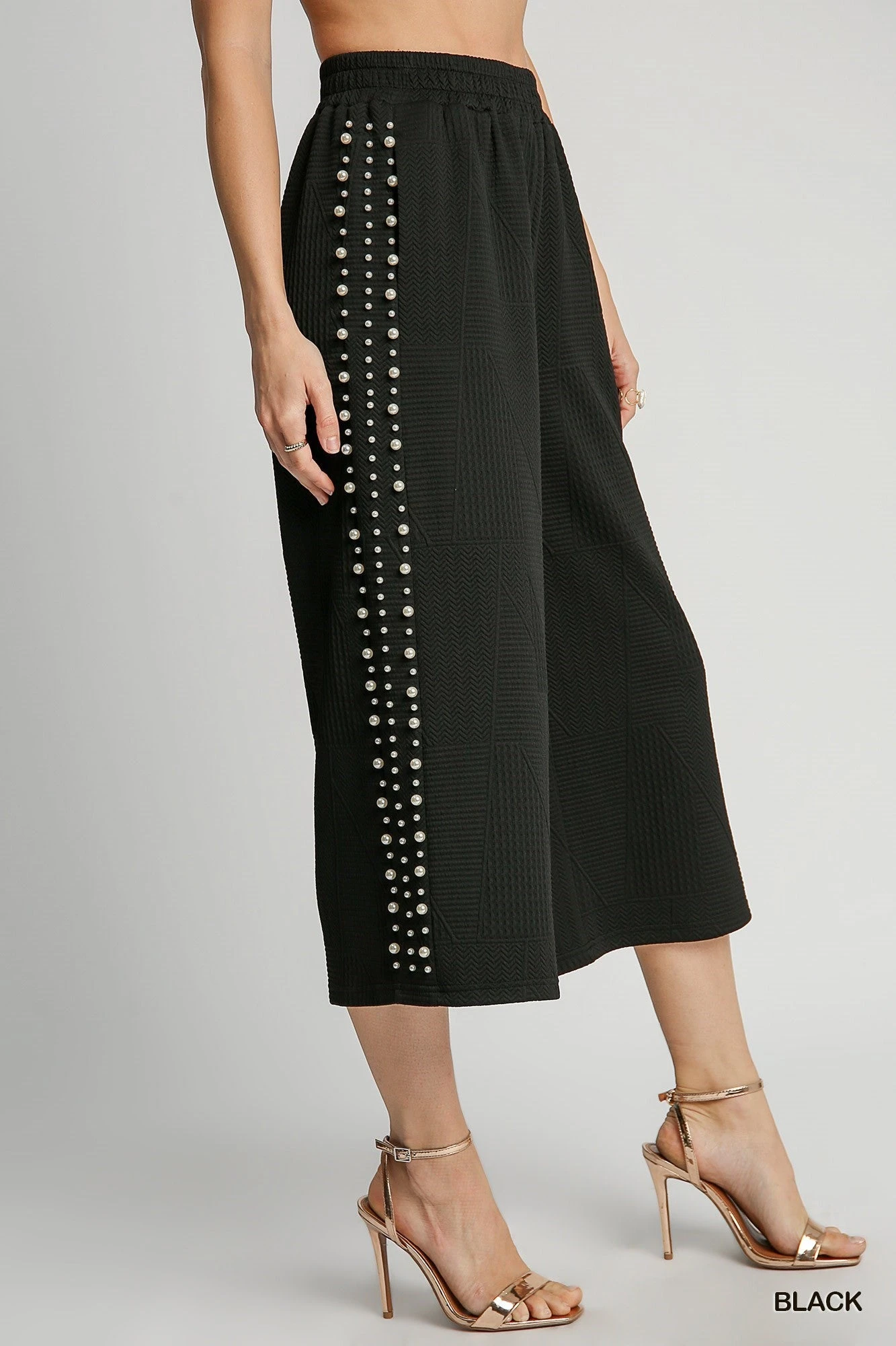 Features: Elastic Waist, Jacquard Solid Color,Studded Pearls down Sides of Legs,Wide Leg
