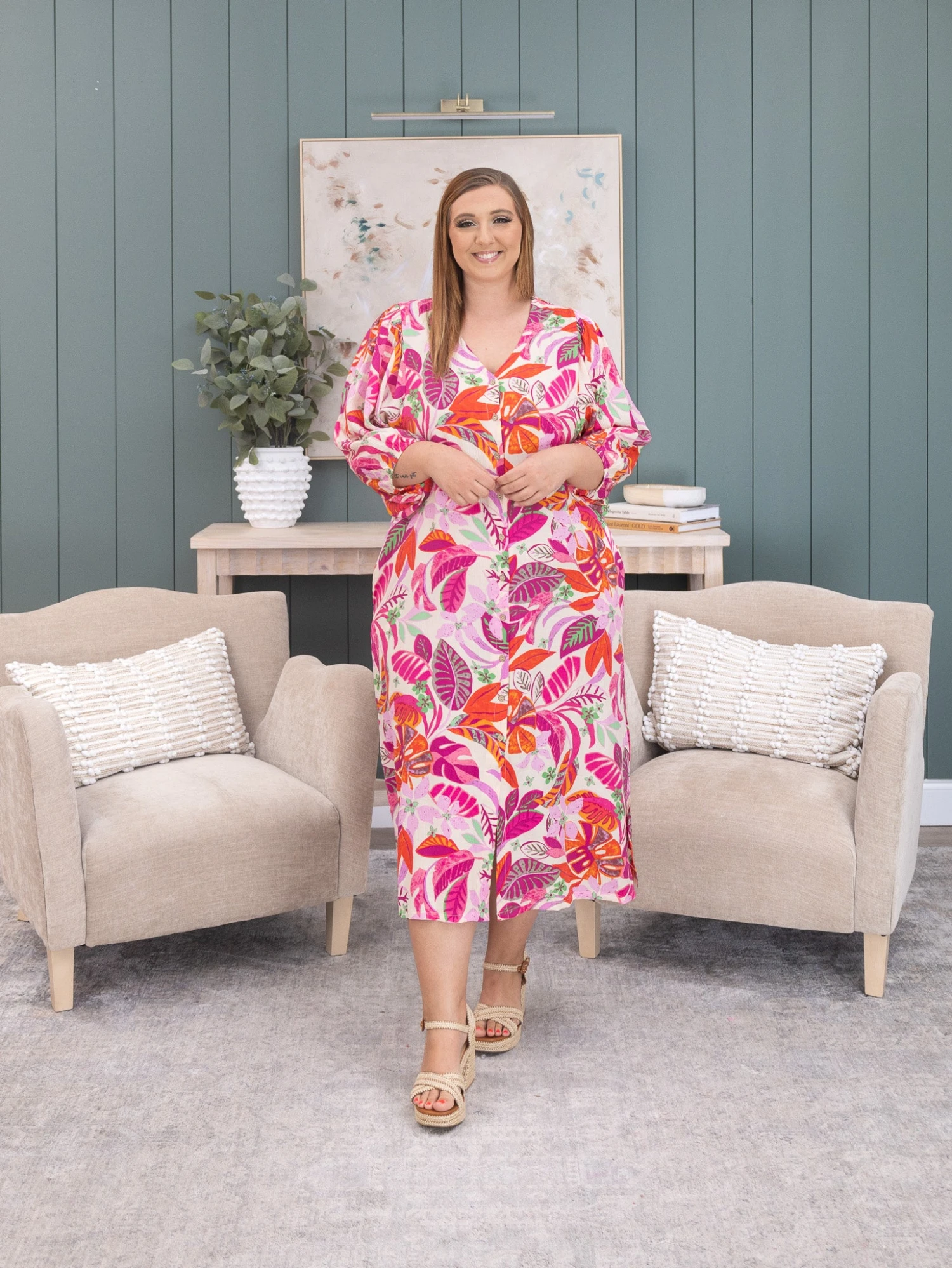 Features: V Neck Button Down, Pockets, 3/4 Puff Sleeve, Side Slits, Printed Midi Dress