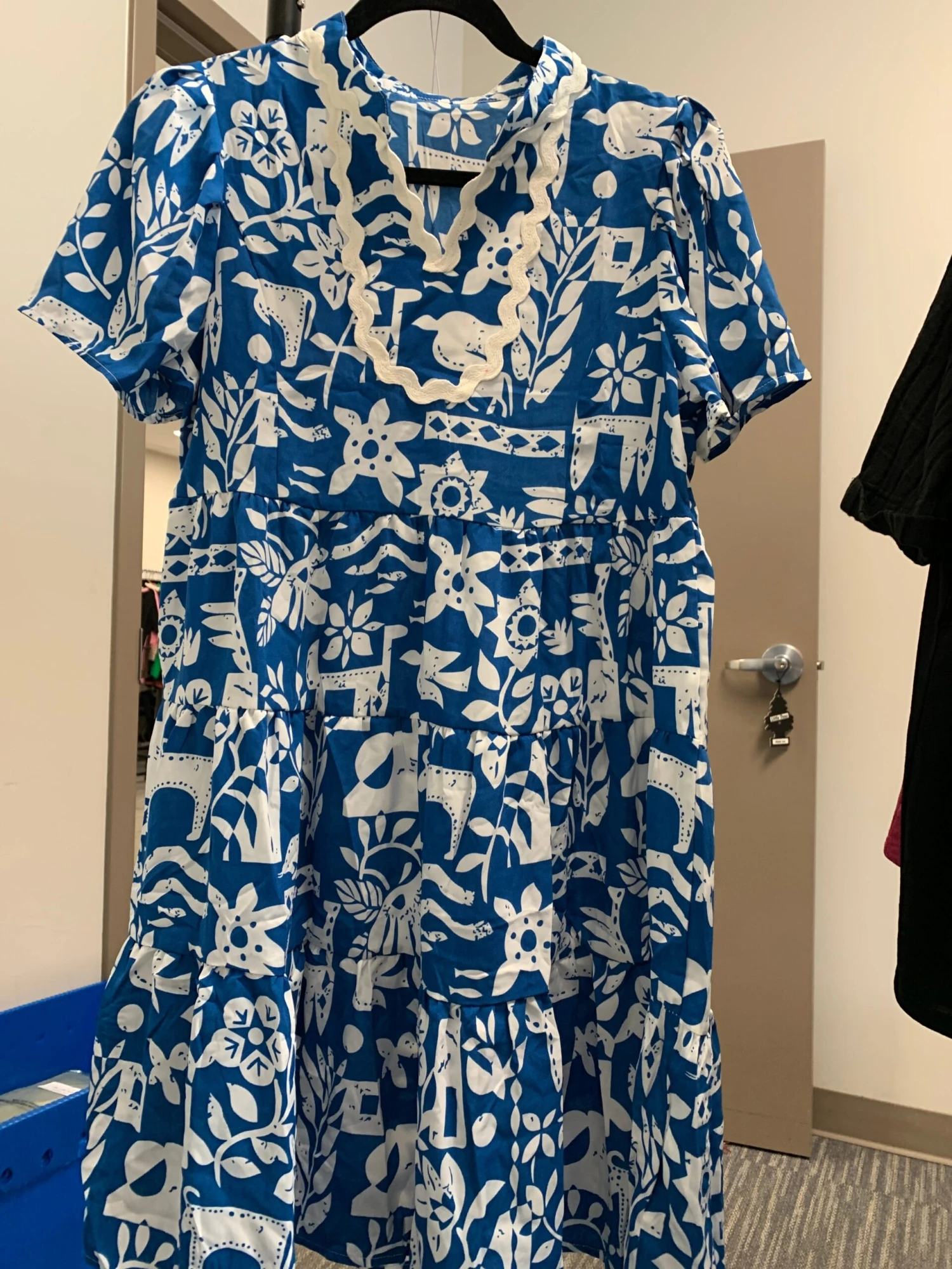Features: V Neck with Trim, Short Sleeve, Round Hem, Printed Dress