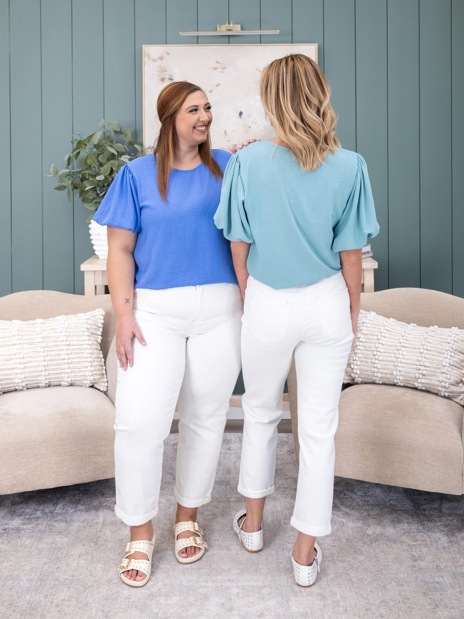 Brittany (short blonde hair) is 5’10, 36B bra, typically wears size S in tops and 3/5 in denim. Wearing size 3