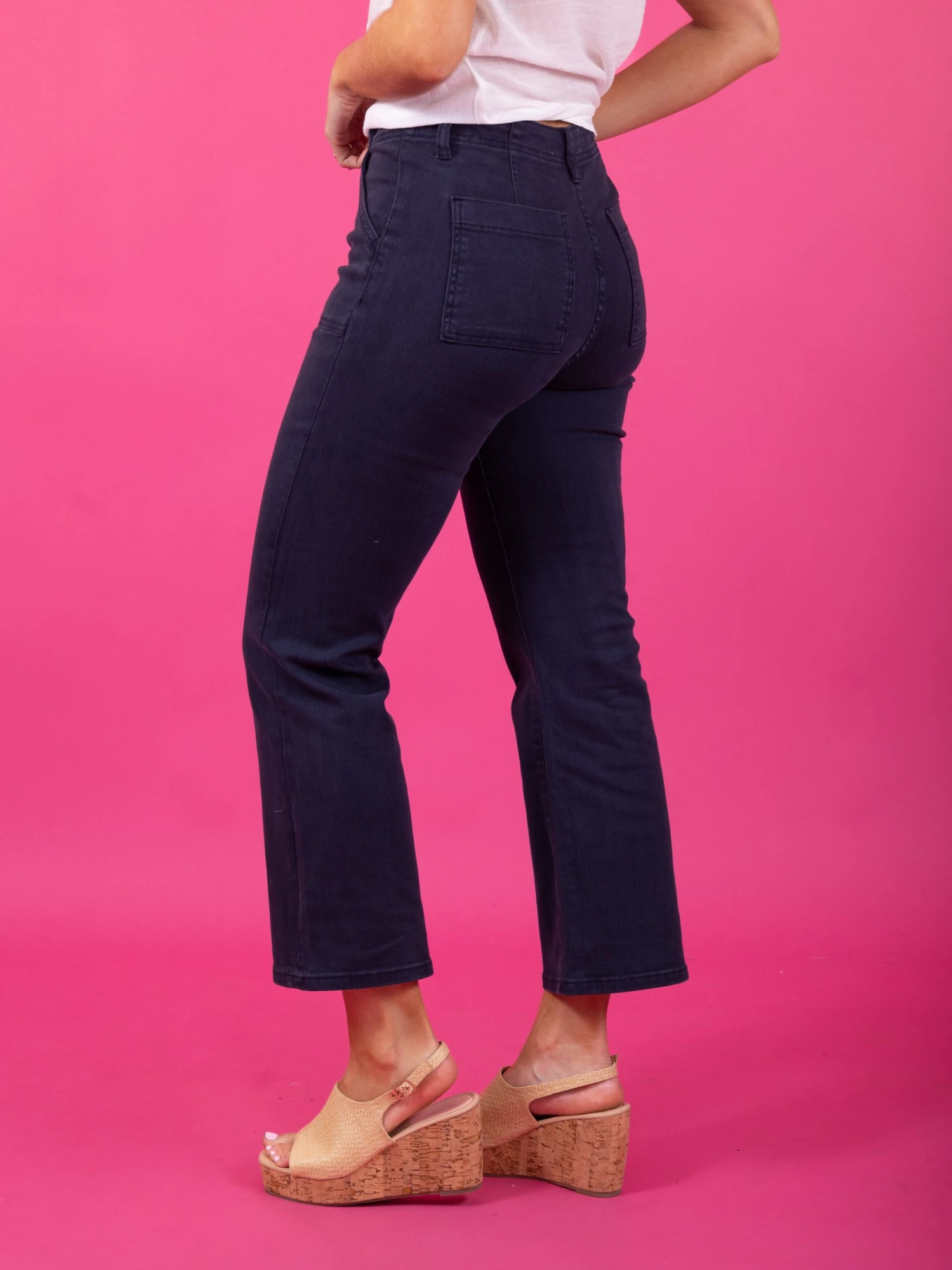 Features: Button Waist, Patch Pockets, Ankle Flare, Dark Wash