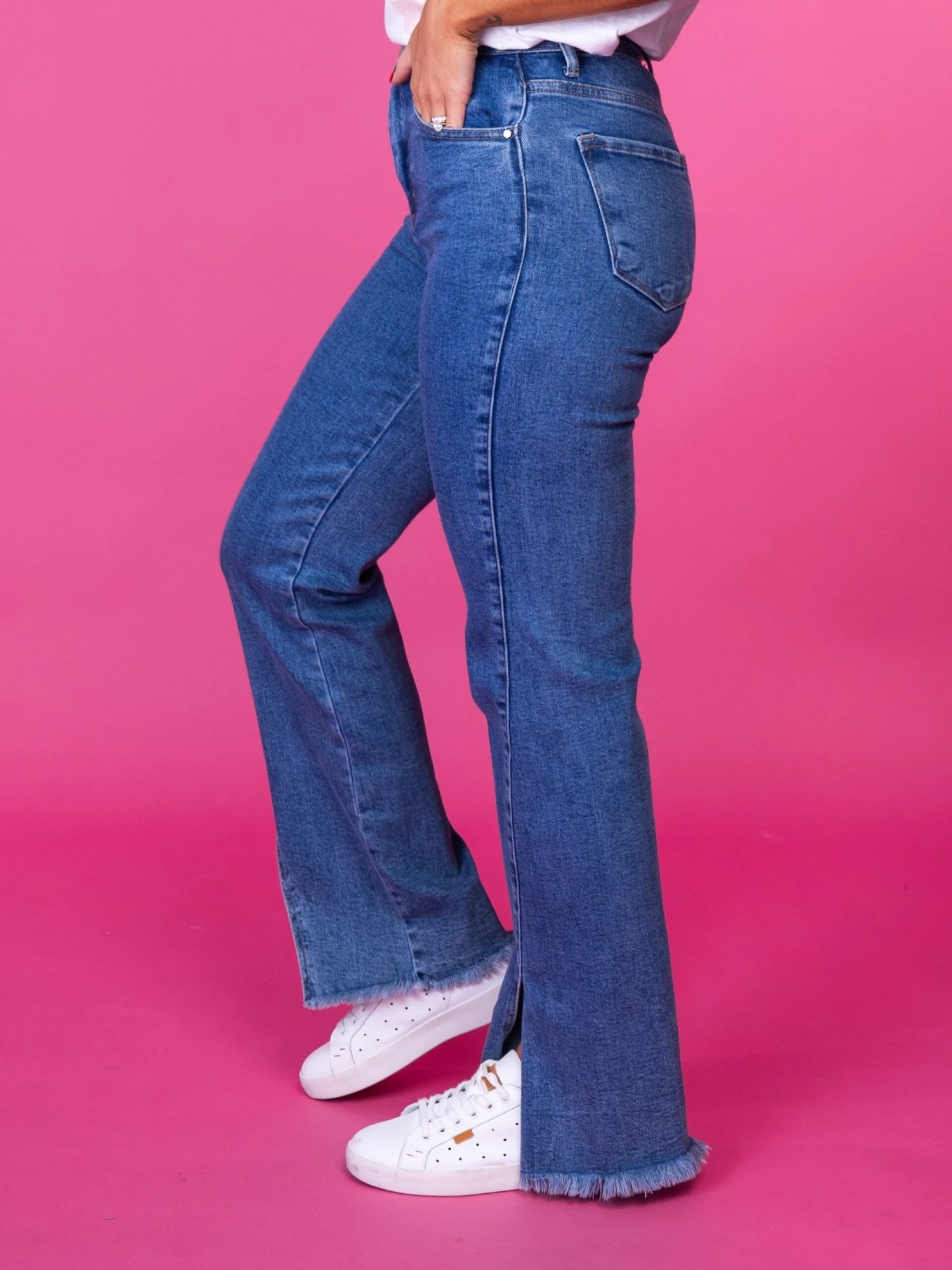 Features: Button Waist, Pockets, Front Slits, Raw Hem