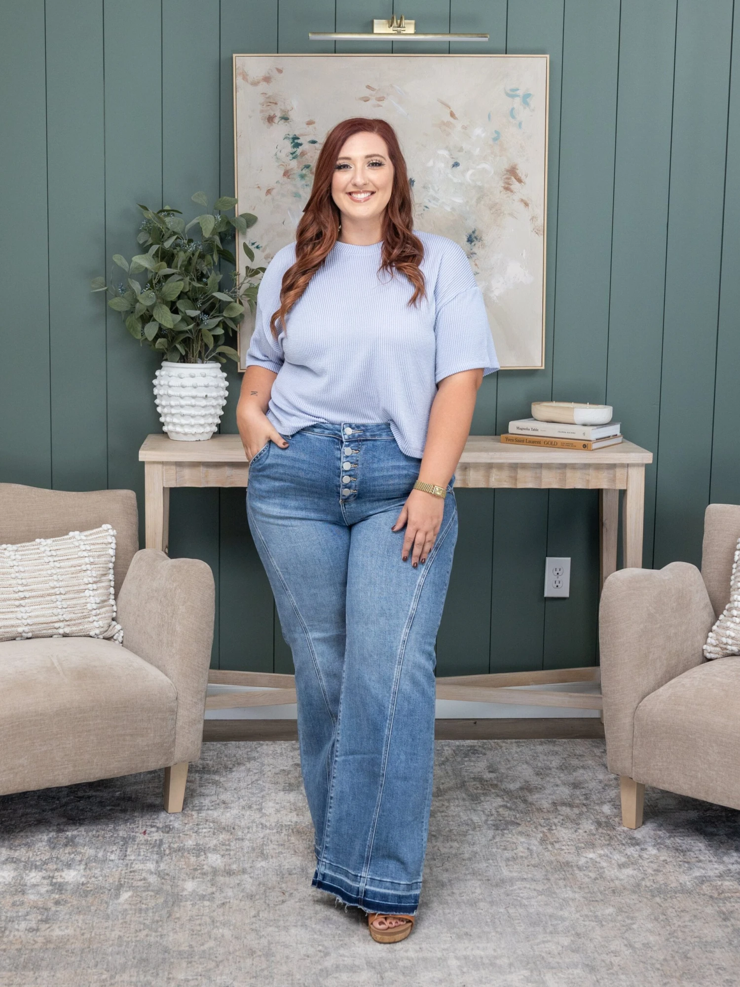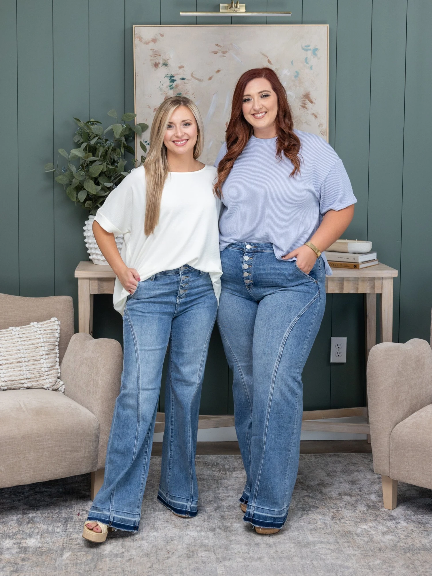Features: Button Fly , High Waist, Pockets, Front Seam Detail, Raw Edge Wide Leg