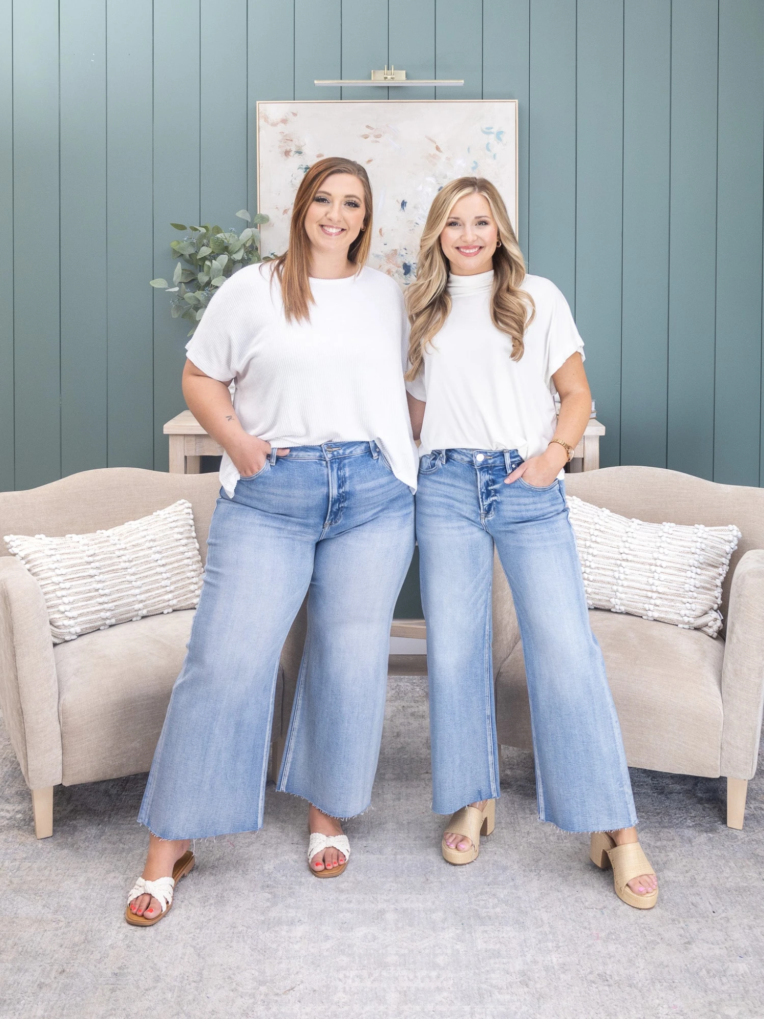 Crimsen (long blonde hair) is 5’1, 34B bra, typically wears size S in tops and 3 in denim. Wearing size 3
