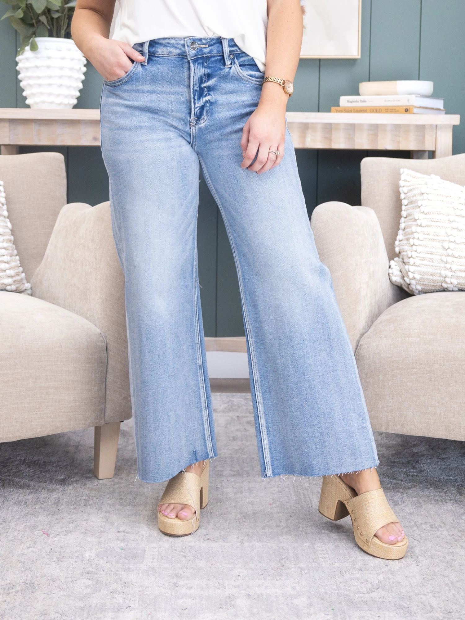 Features: Mid Rise, Pockets, Cropped, Raw Hem Wide Leg