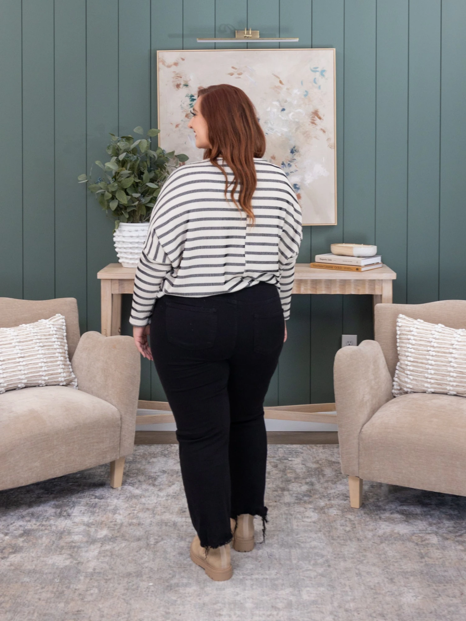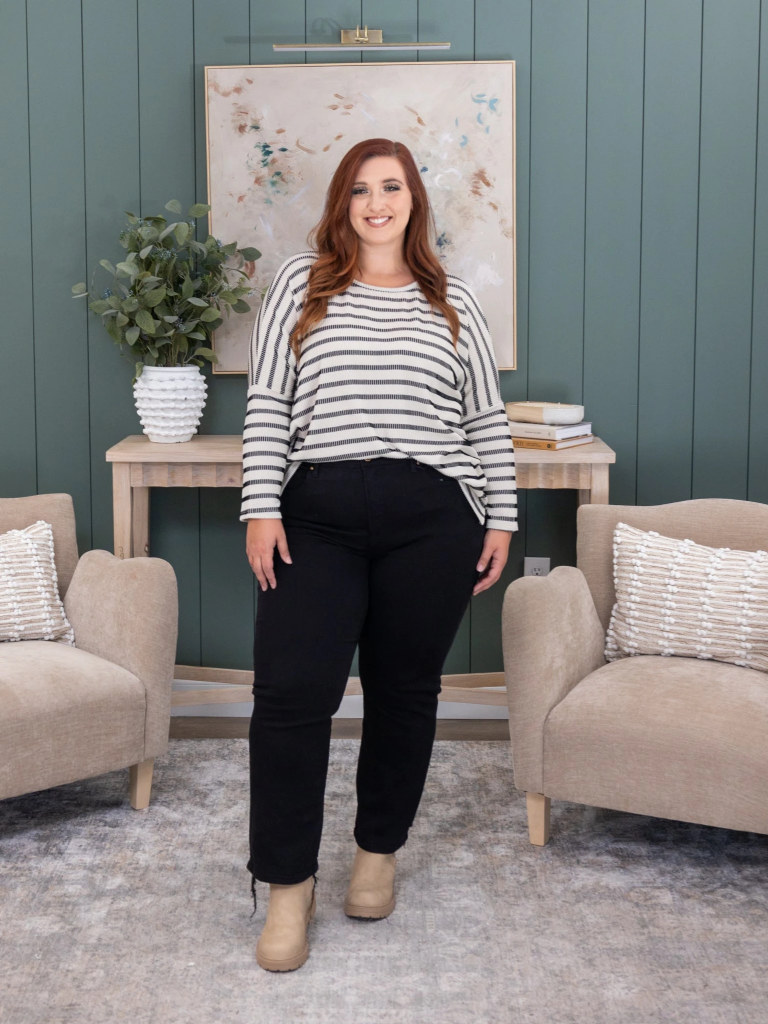 Features: Zipper Fly, Tummy Control High Rise, Shark Bite Hem, Straight Leg Jean