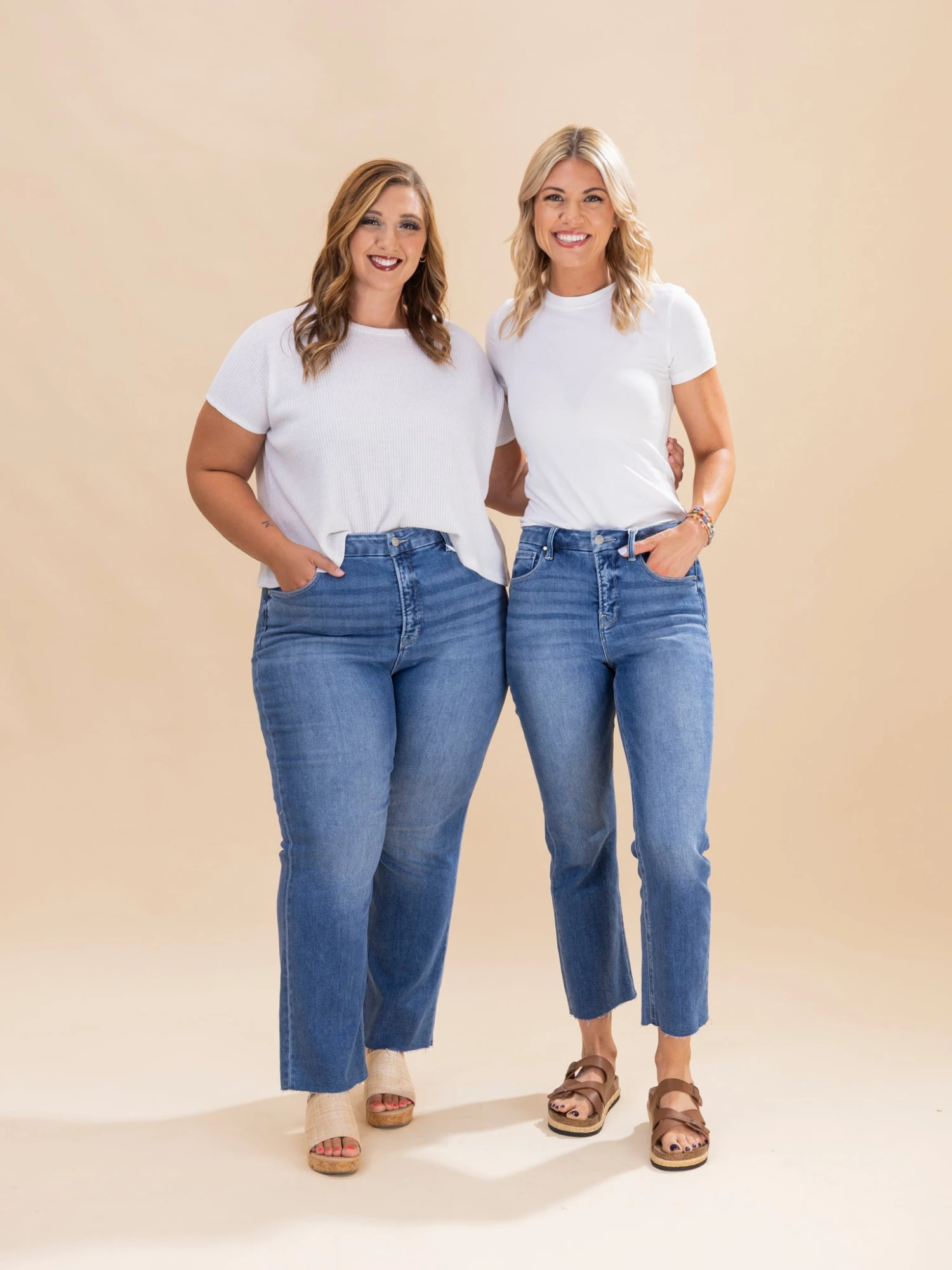Brittany (short blonde hair) is 5’10, 36B bra, typically wears size S in tops and 3 in denim. Wearing size 3