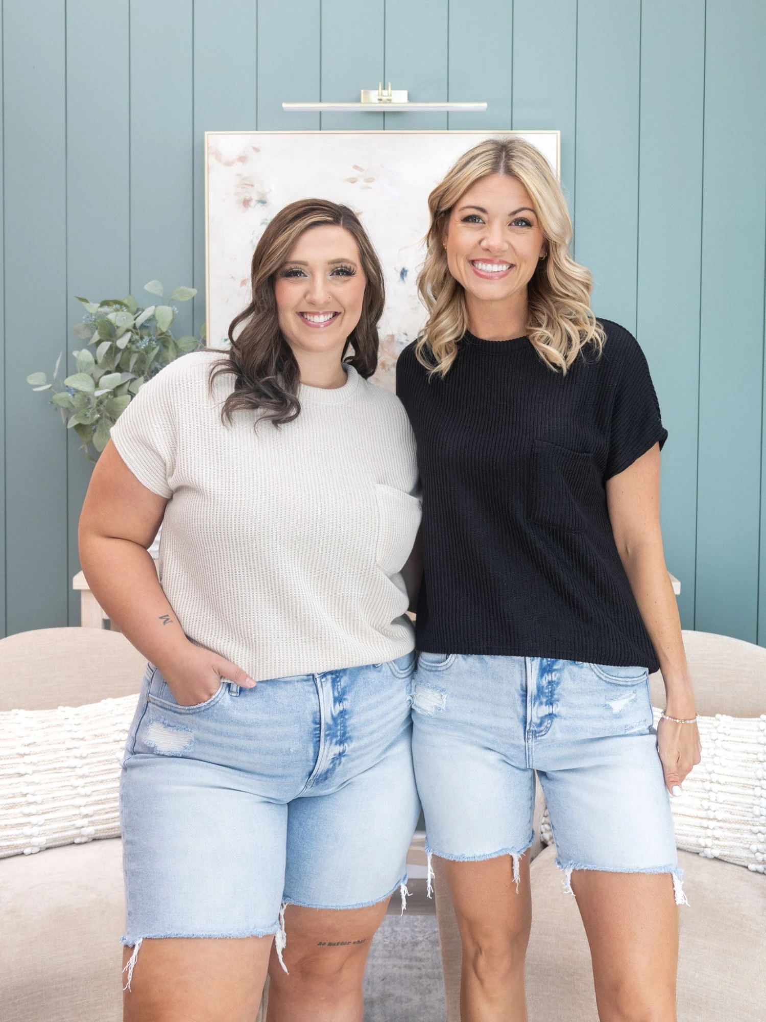 Brittany (short blonde hair) is 5’10, 36B bra, typically wears size S in tops and 3 in denim. Wearing size 3
