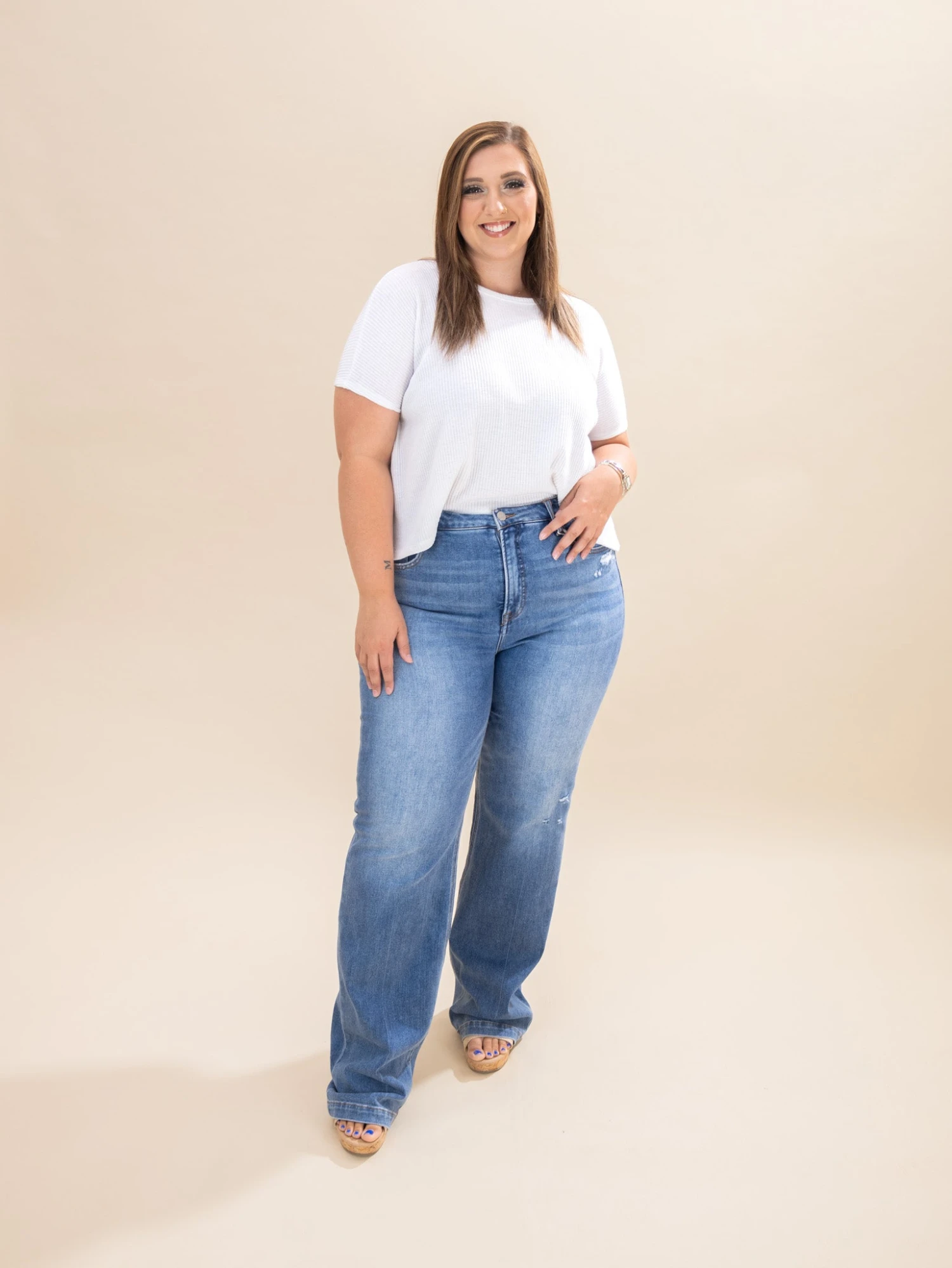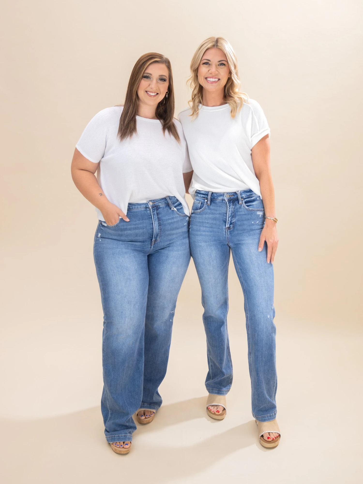 Features: Button/Zipper Waist, High Rise, Tummy Control, Slight Distressing, Straight Leg