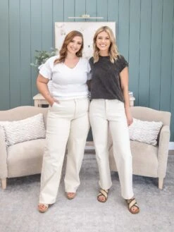Brittany (short blonde hair) is 5’10, 36B bra, typically wears size S in tops and 3 in denim. Wearing size 3