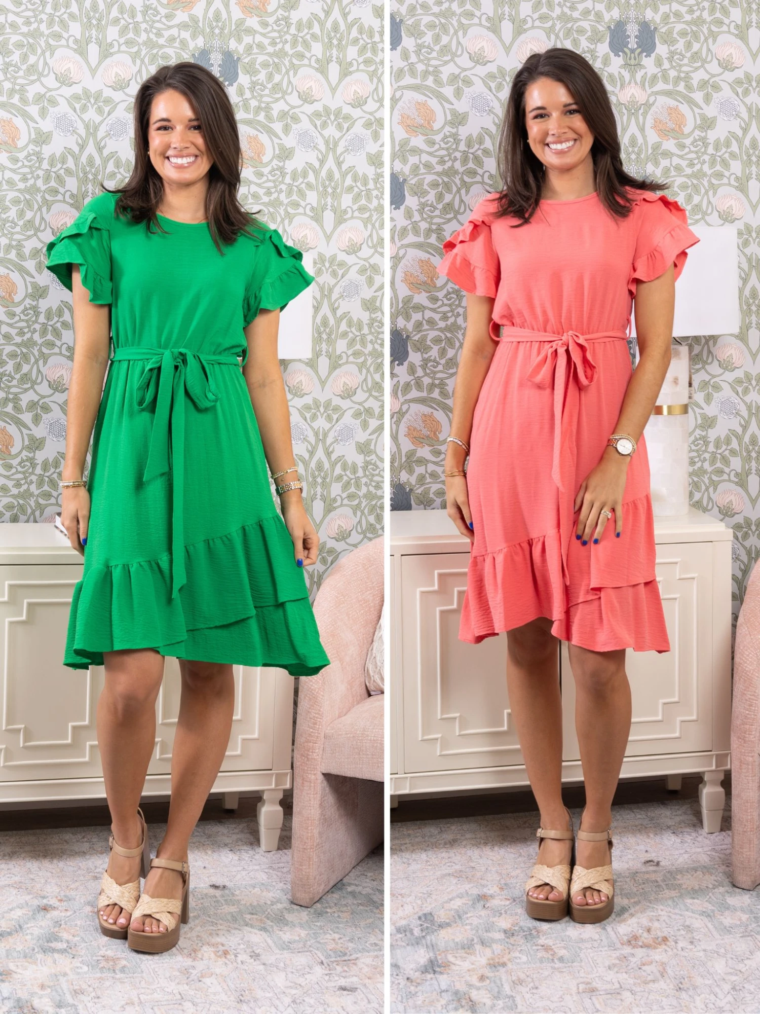 Features: Round Neck, Ruffle Sleeves, Tie Waist