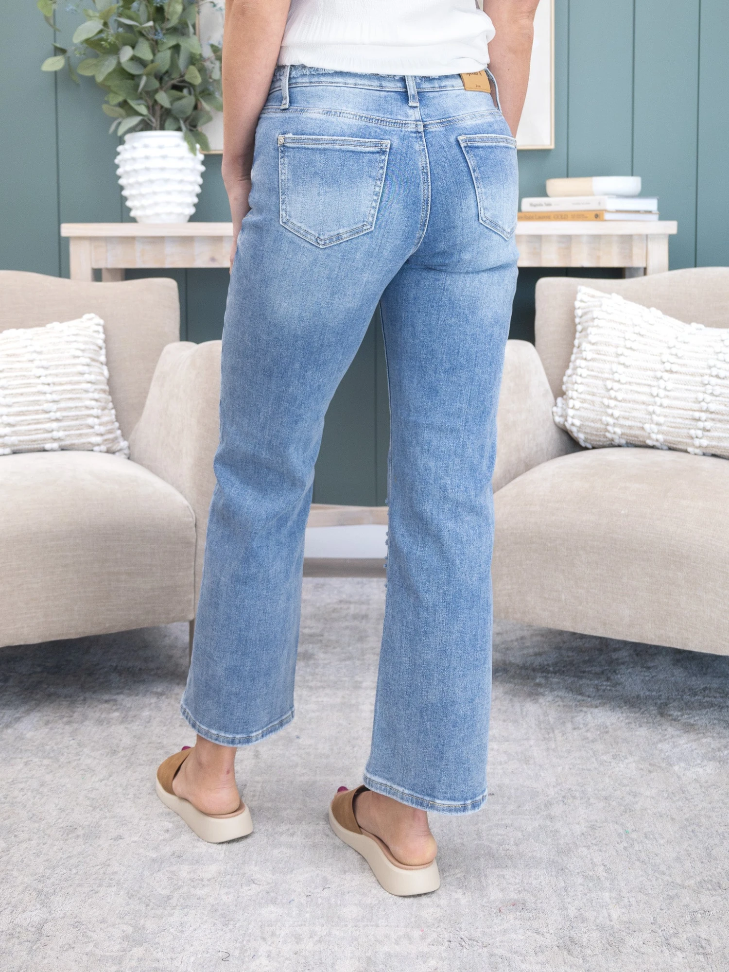 Features: Button/Zipper Fly, High Rise, Distressed Detail, Dad Jean