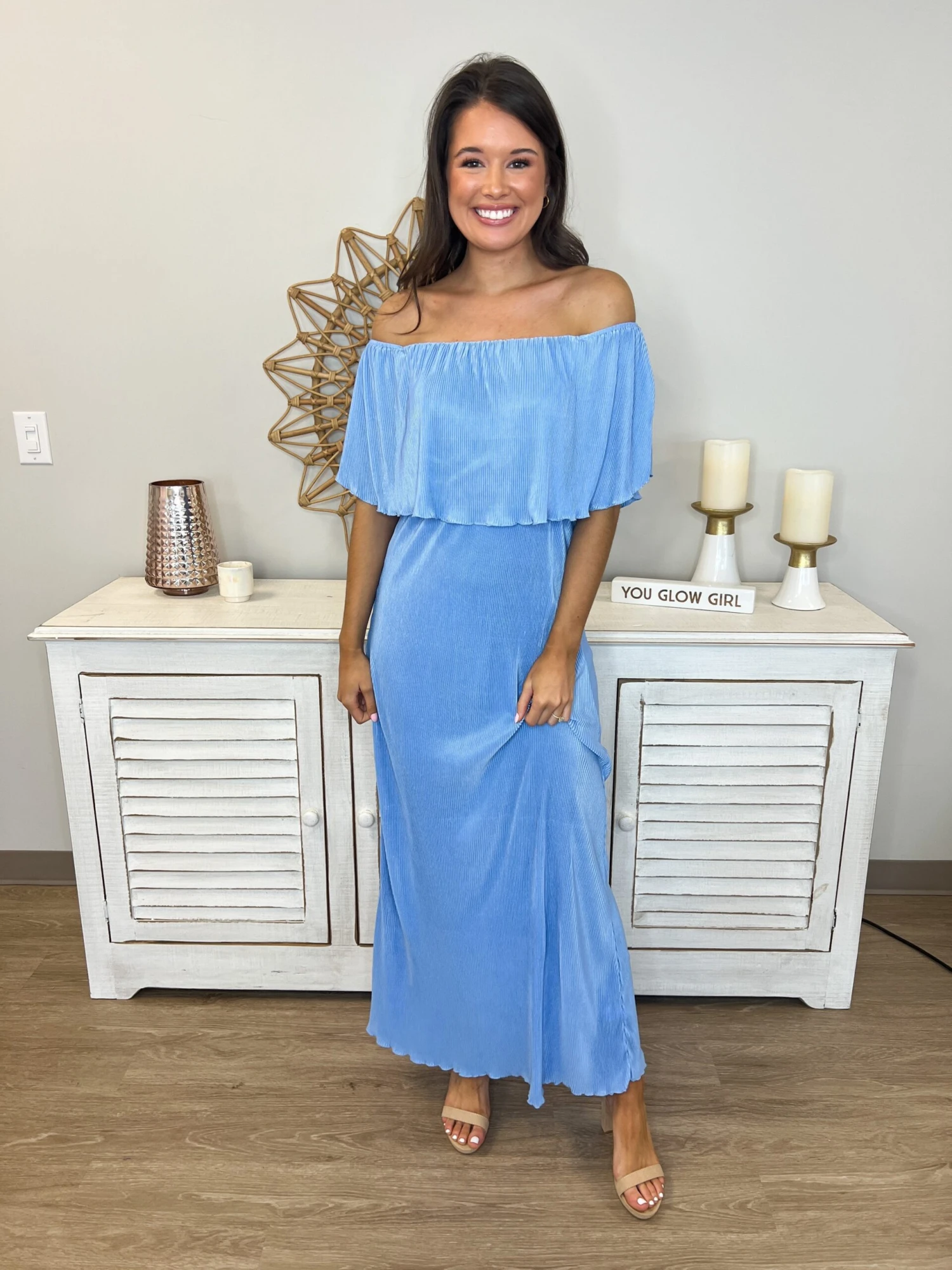 The “See The Ocean Dress” is here for you! This maxi dress is simply so gorgeous! With an elastic waist and flutter sleeves, you need this one in your life! Such a flattering design, you cannot go wrong! Snag one today!
