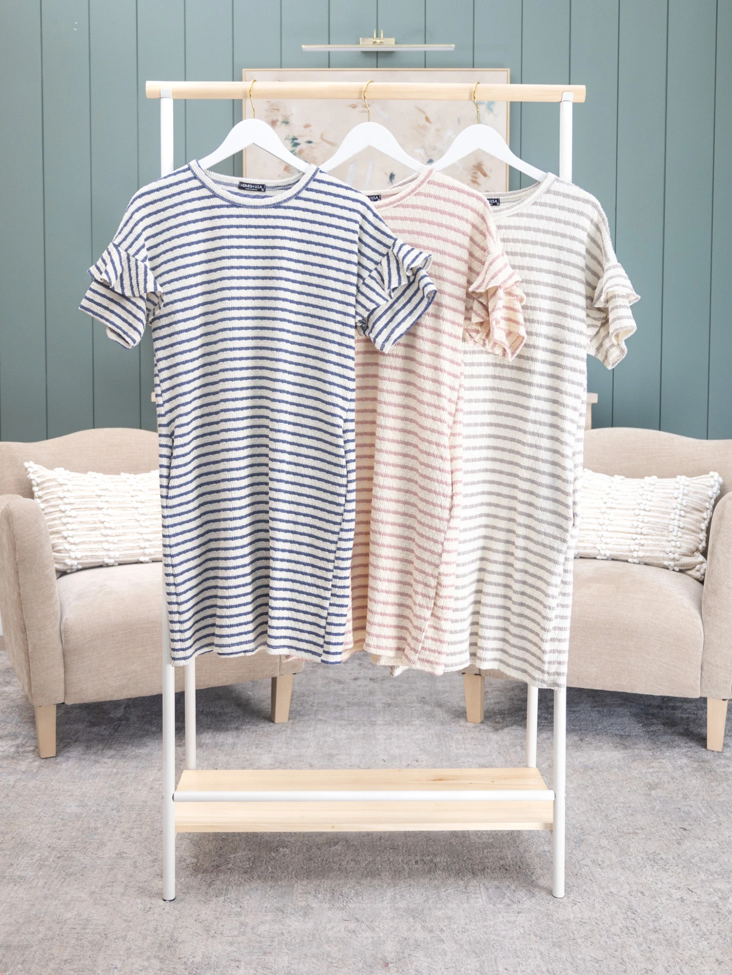 Features: Round Neck, Ruffle Short Sleeves, Pockets, Jacquard Striped Dress