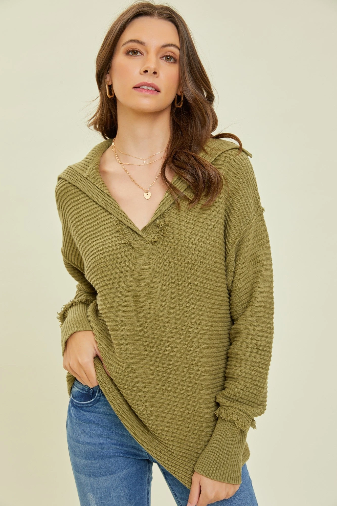 Features: solid print, ribbed, split v neck, collared, long sleeve, distressed detail