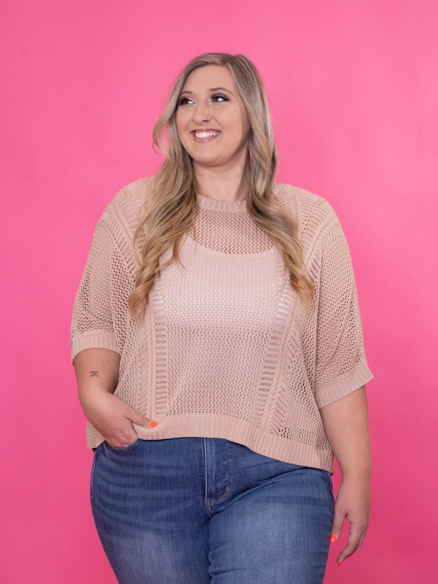 This open knit design is so lightweight and airy! Perfect for pairing with shorts or using as a coverup for your swim!