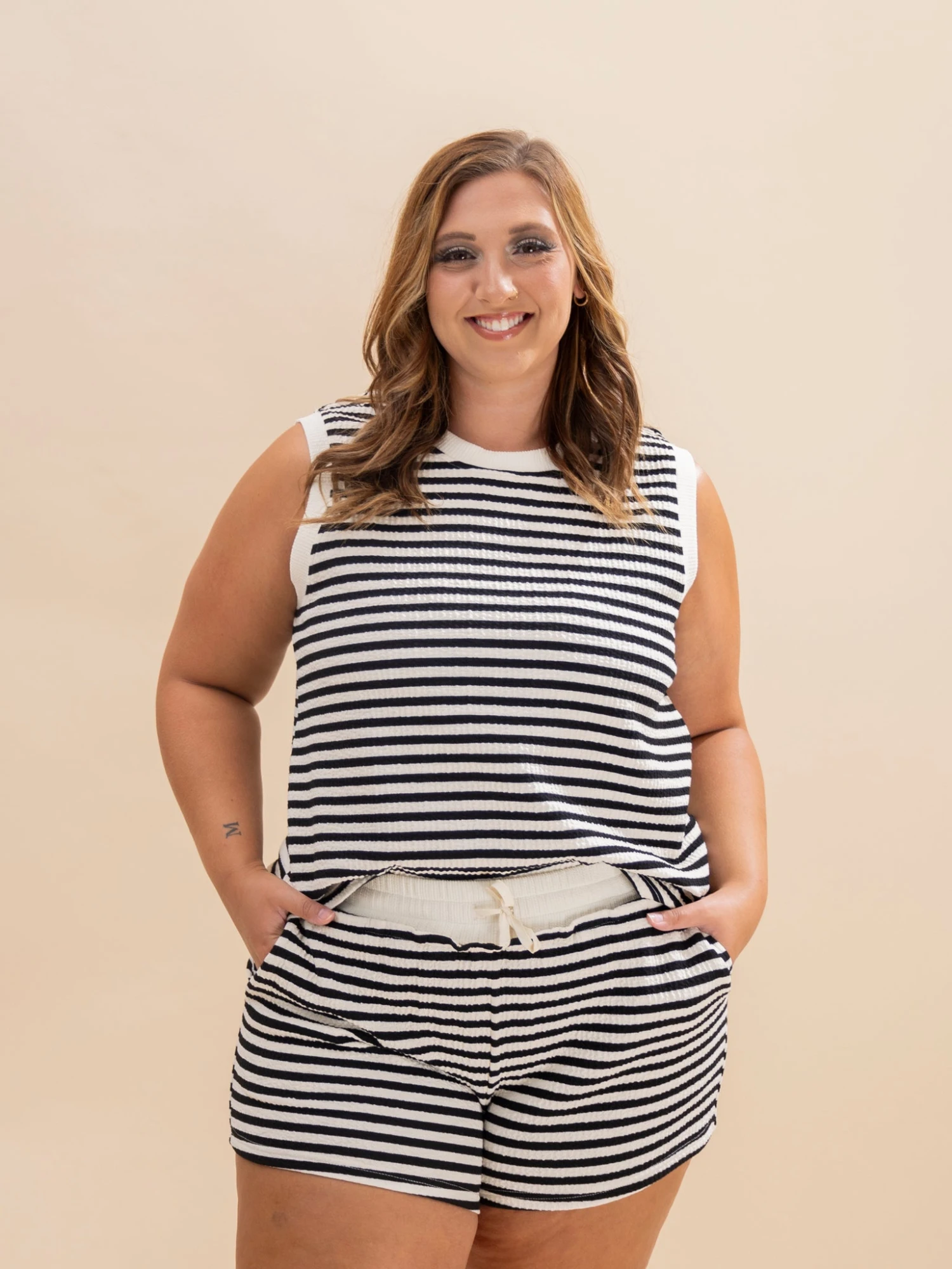 Features: Drawstring Elastic Waistband, Pockets, Textured Striped Shorts