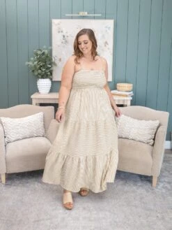 Features: Square Neck, Smocked, Adjustable Straps w/ Beads, Striped Tiered Maxi Dress