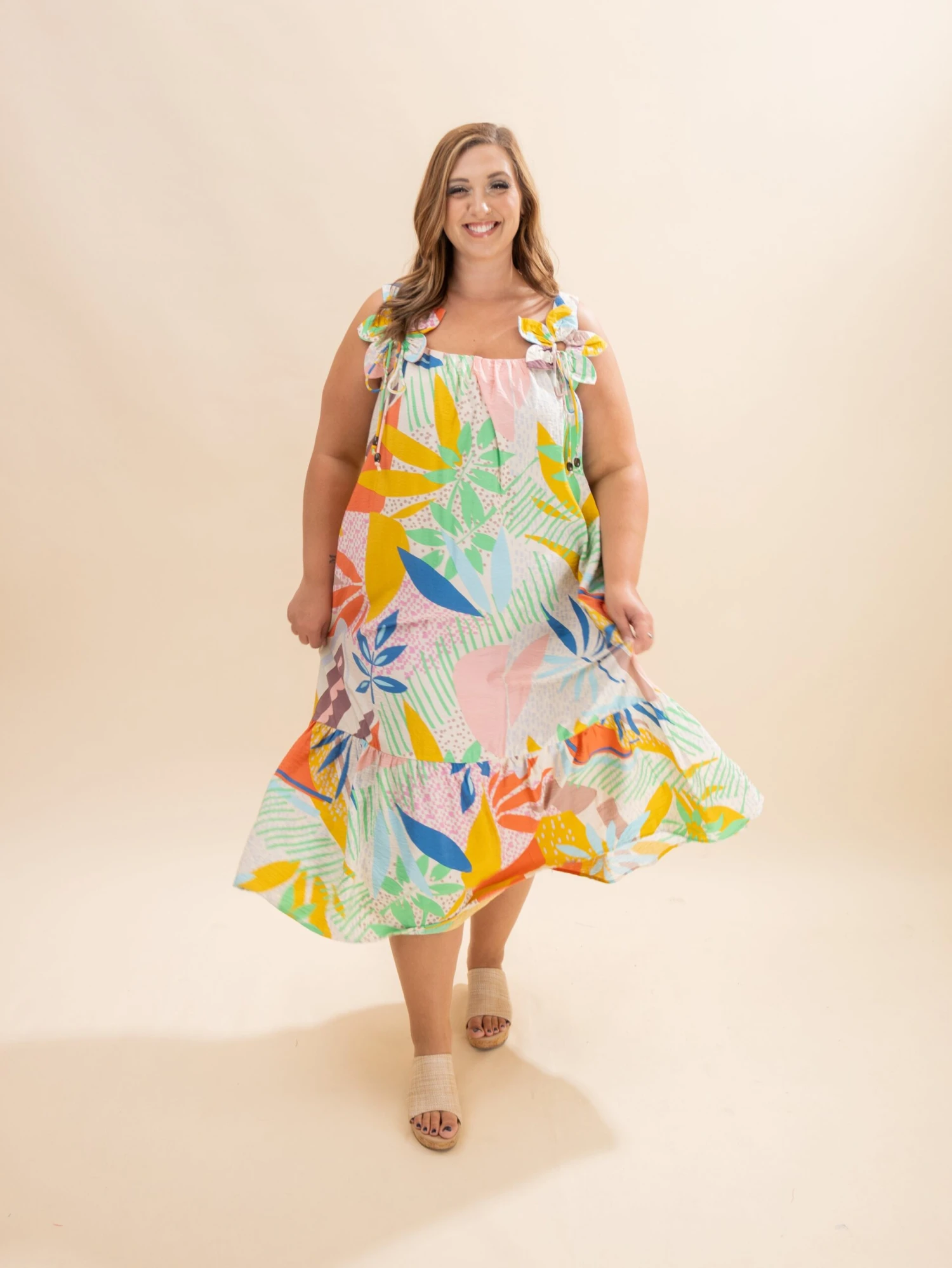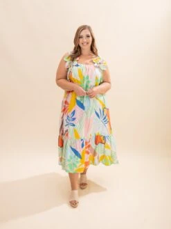 Features: Square Neck, Sleeves, 3 D Flower Detail On Strap, Pockets, Tropical Printed Dress