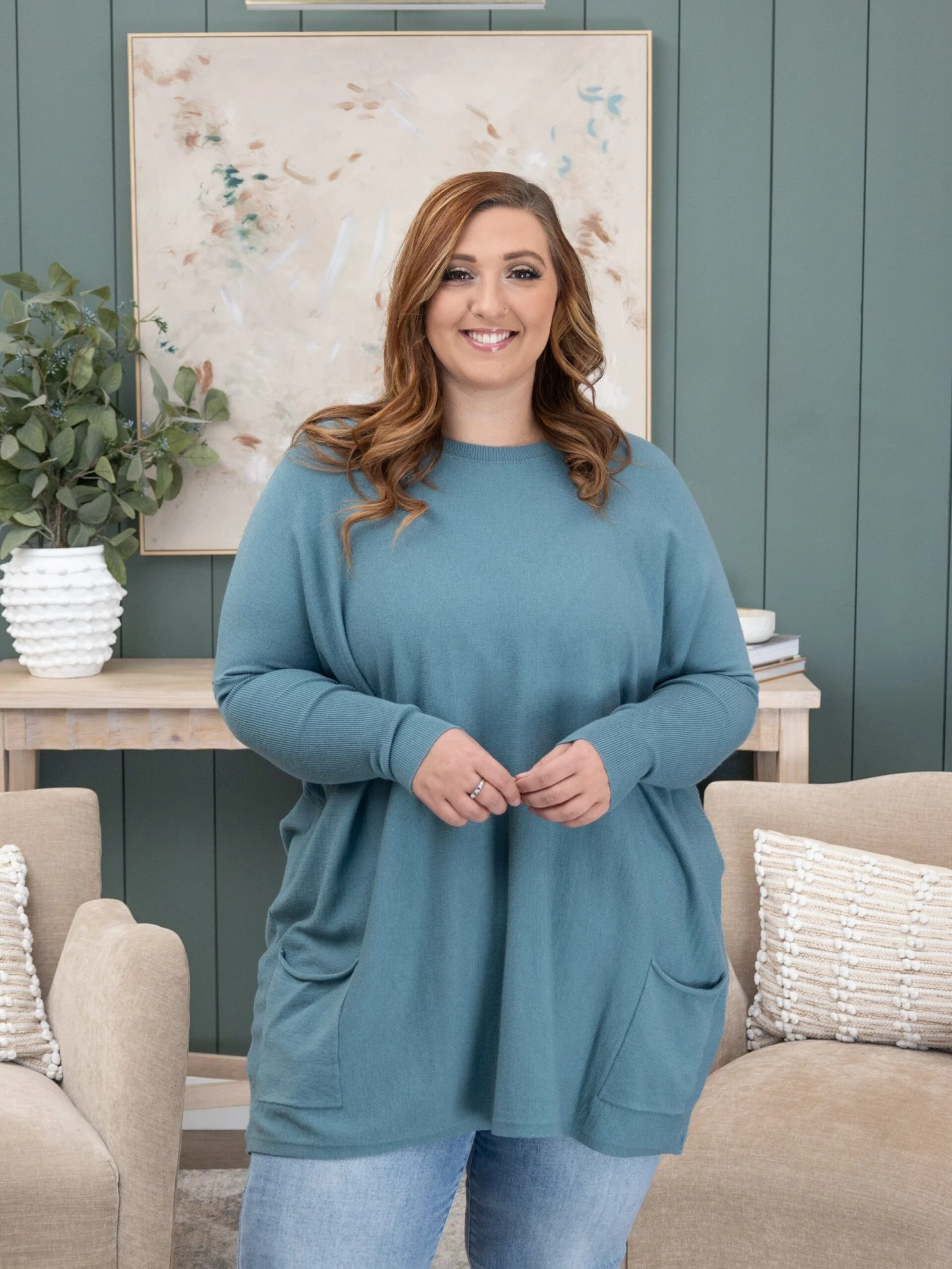 Erin is 5’8, 36C bra, typically wears size L/XL in tops and 14/15 in denim. Wearing size XL. This has a stretchy oversized fit. If you are between sizes you can size down.