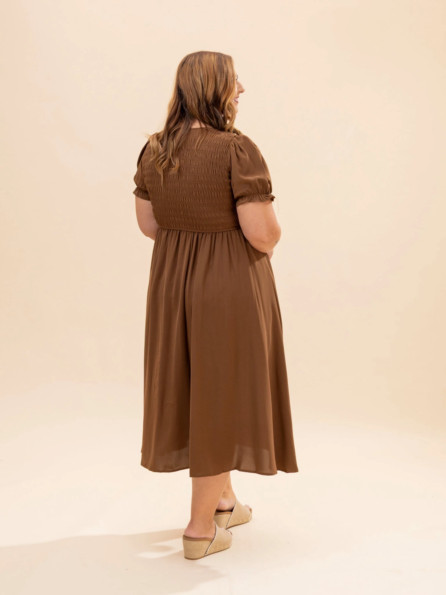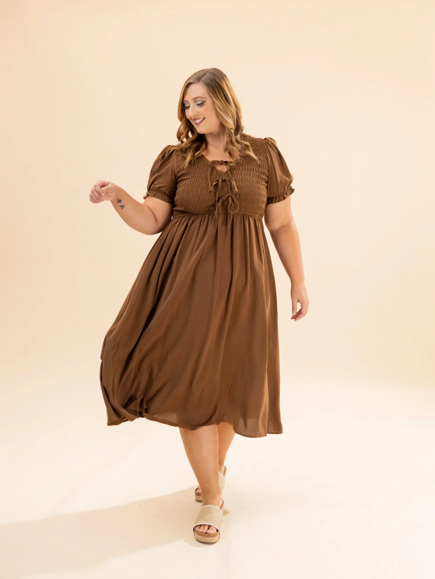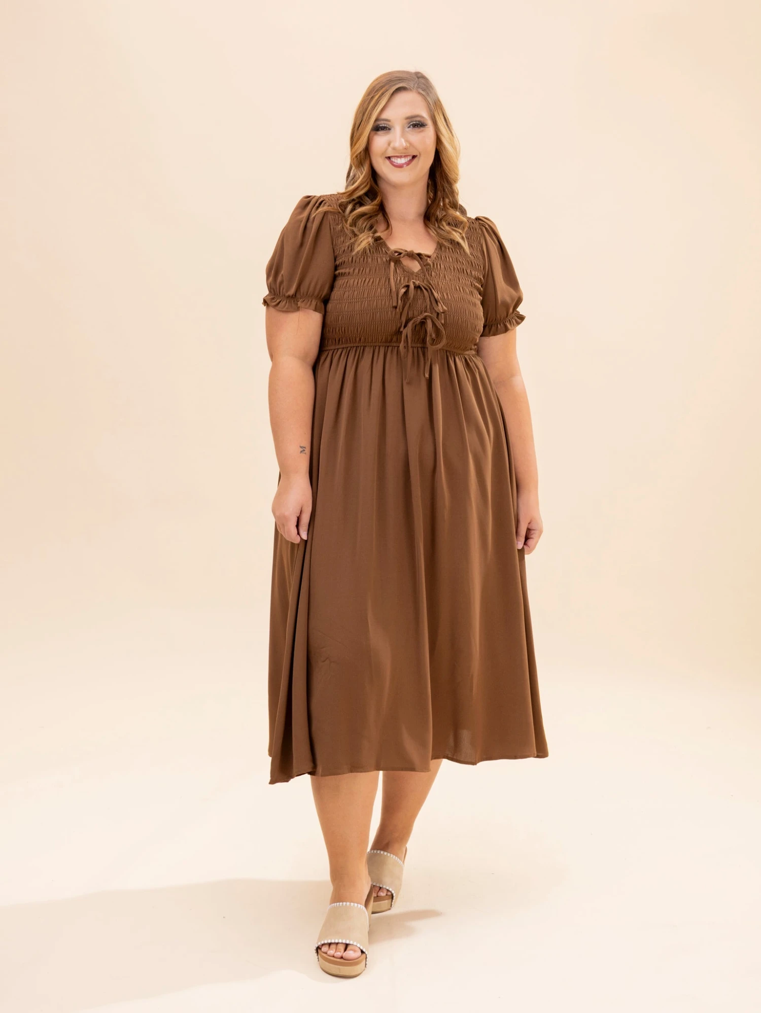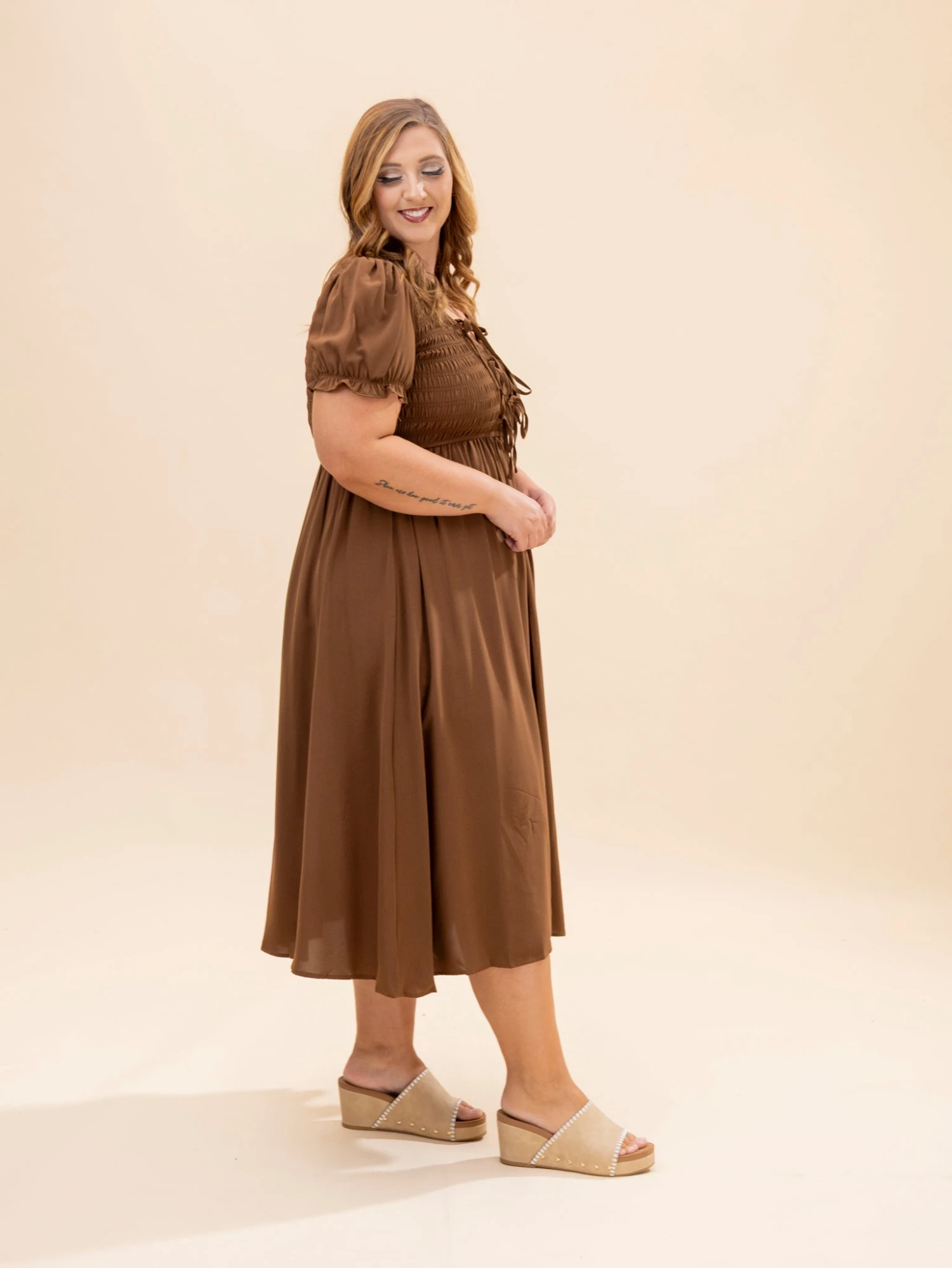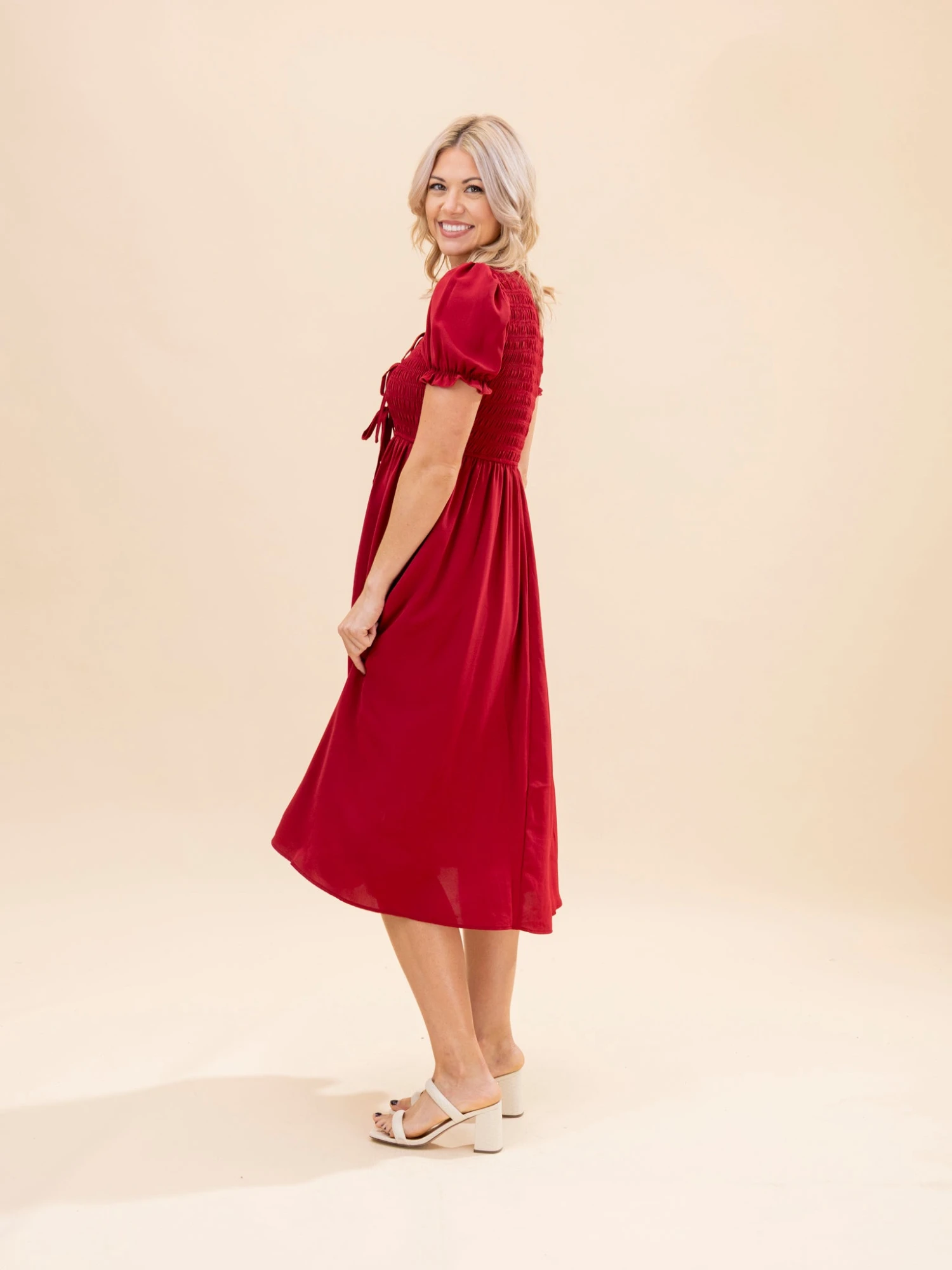 Features: V Neck w/ Self Tie, Smocked, Short Puff Sleeves, Midi Dress