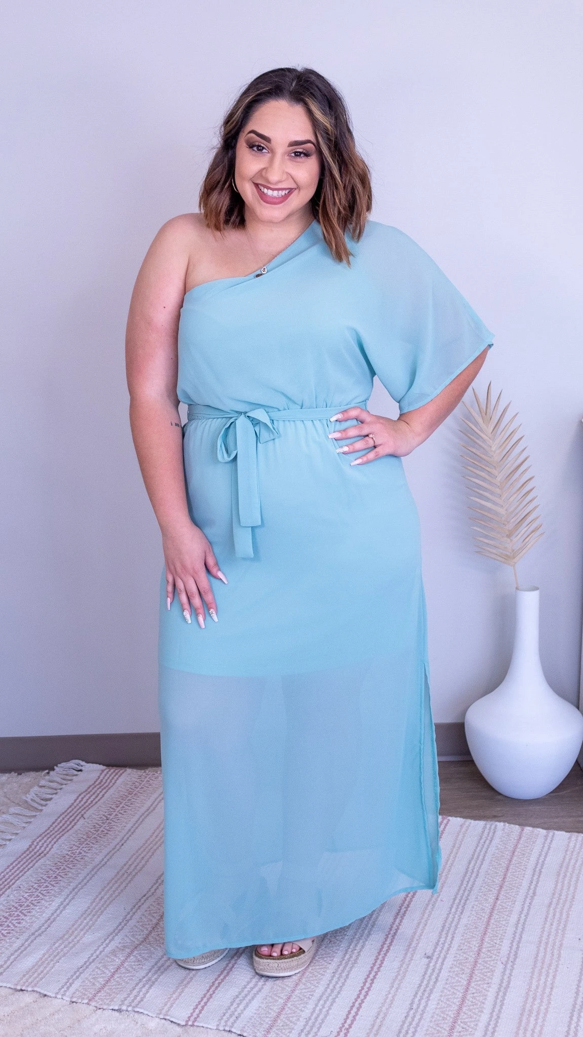 Features:One shoulder sleeve, Side slits, Sash bow, Tiered detail