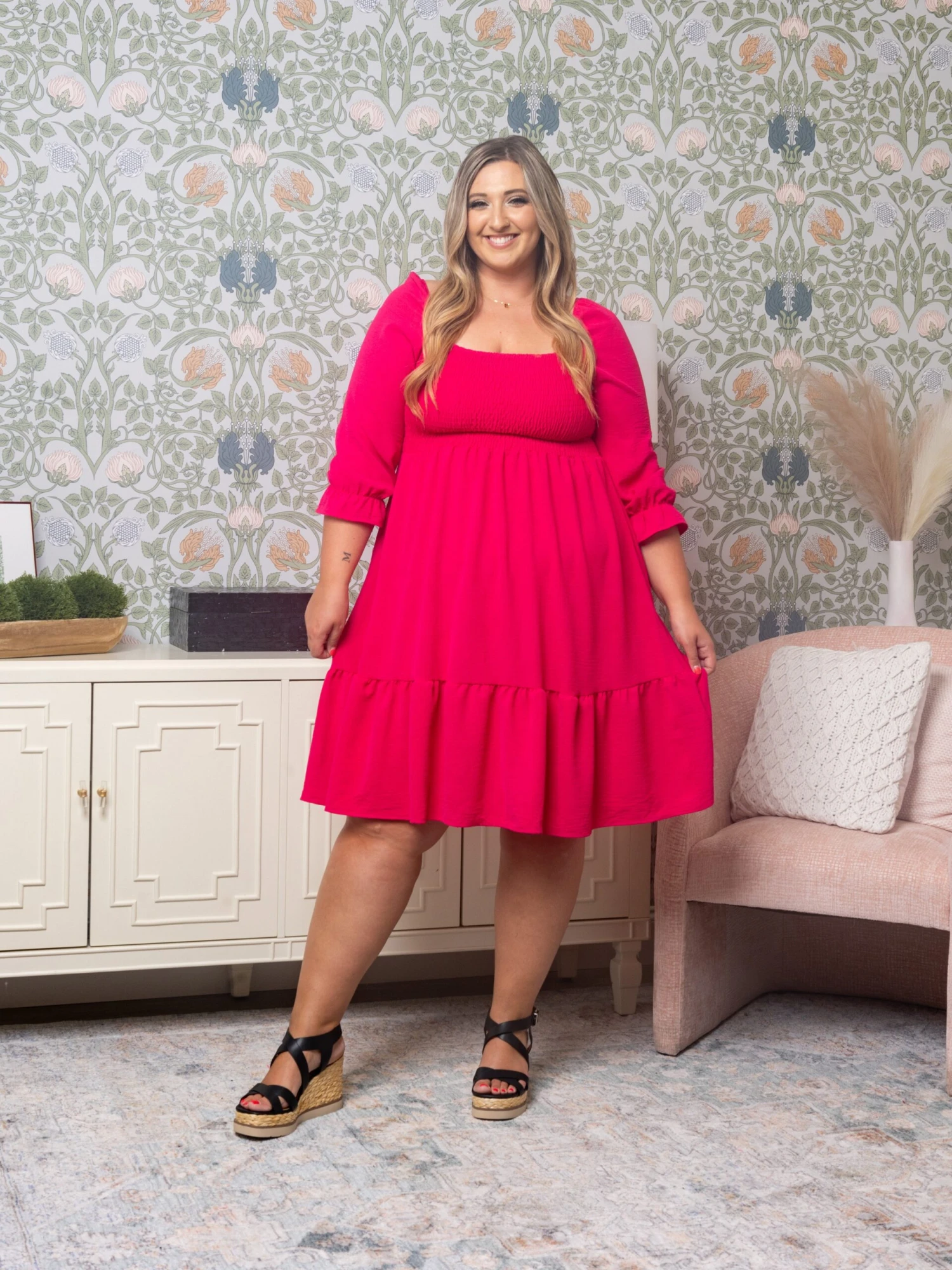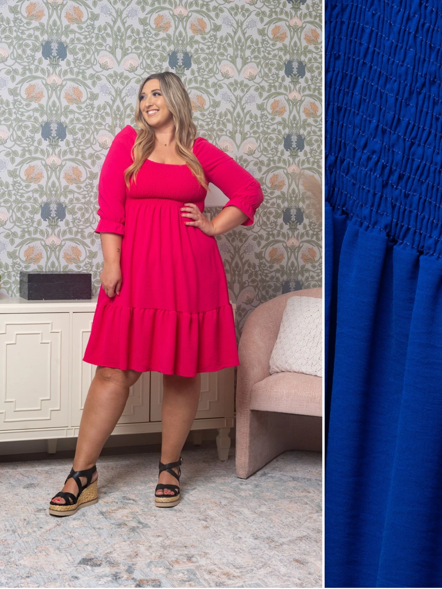 Features: Square Neck, 3/4 Sleeves, Smocked