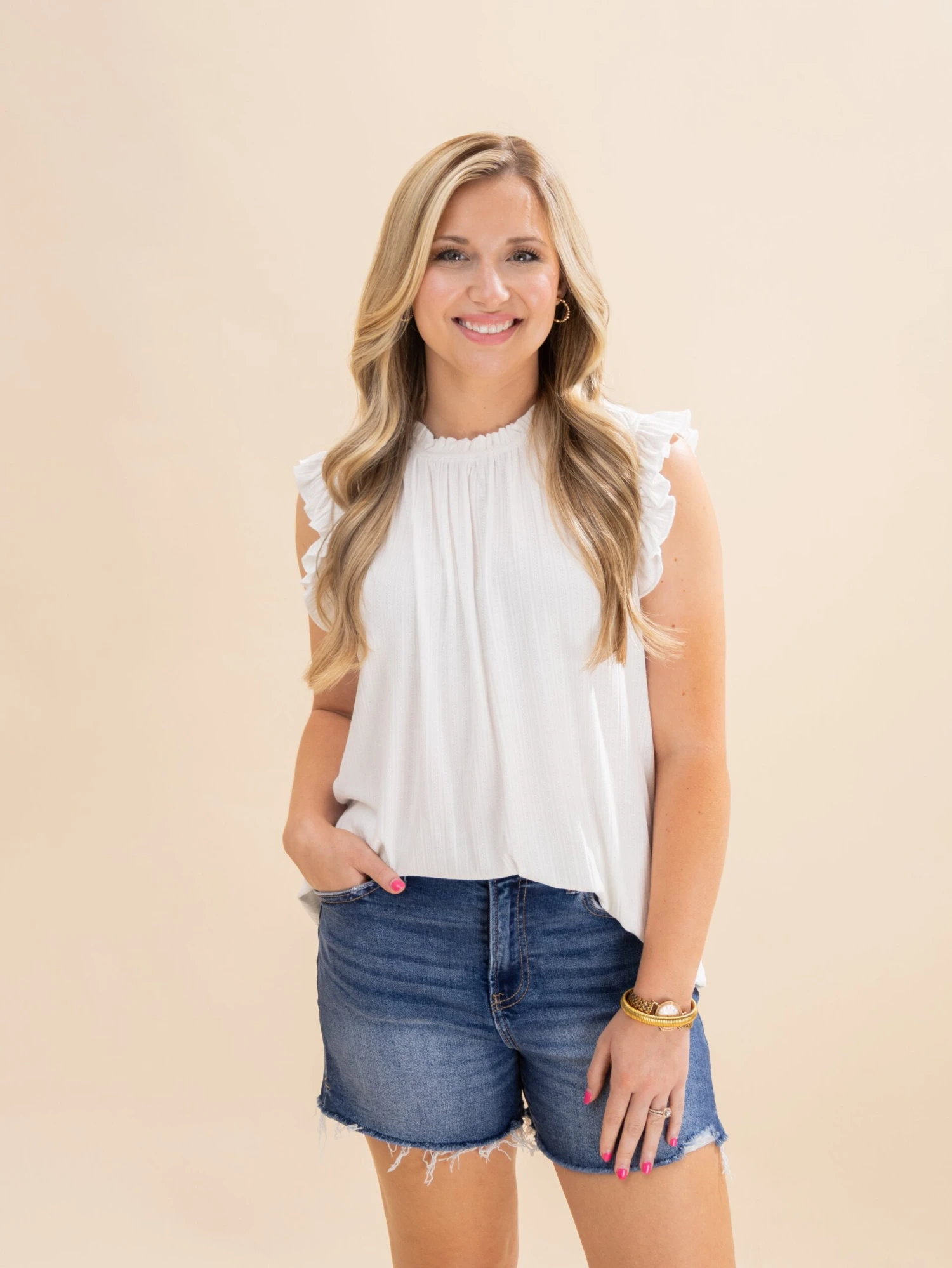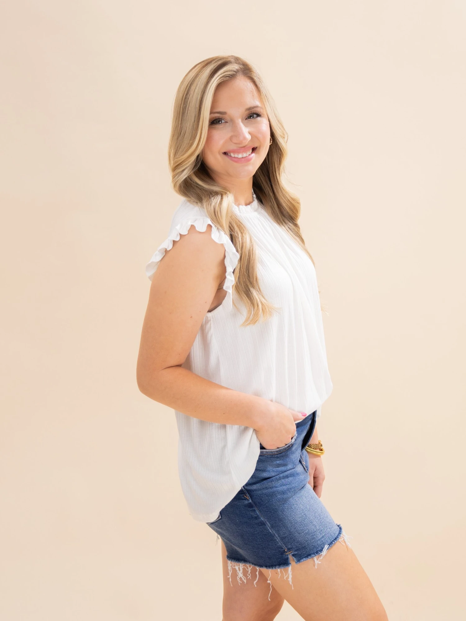 Crimsen (long blonde hair) is 5’1, 34B bra, typically wears size S in tops and 3 in denim. Wearing size S