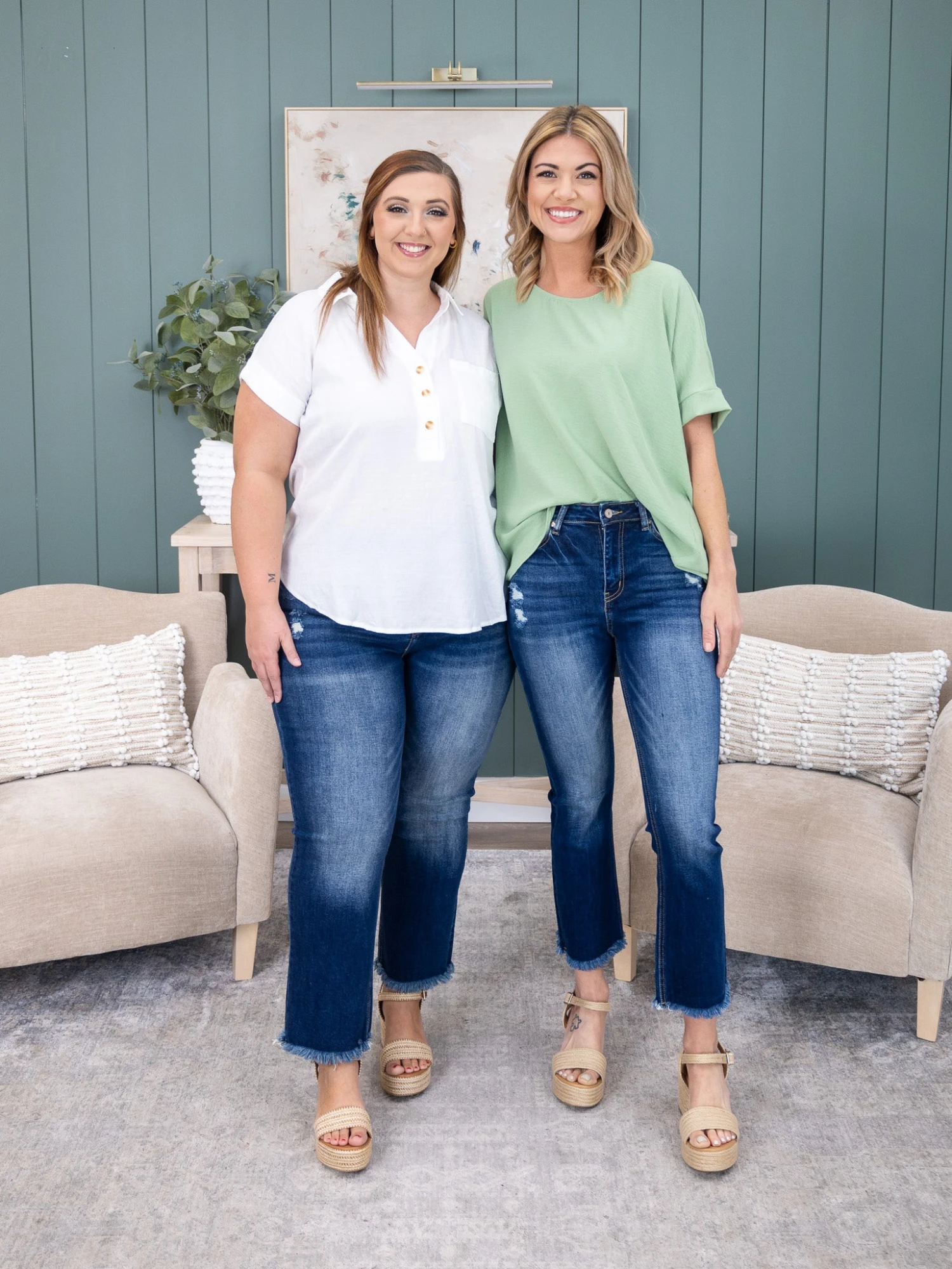 Brittany (short blonde hair) is 5’10, 36B bra, typically wears size S in tops and 3/5 in denim. Wearing size 3.