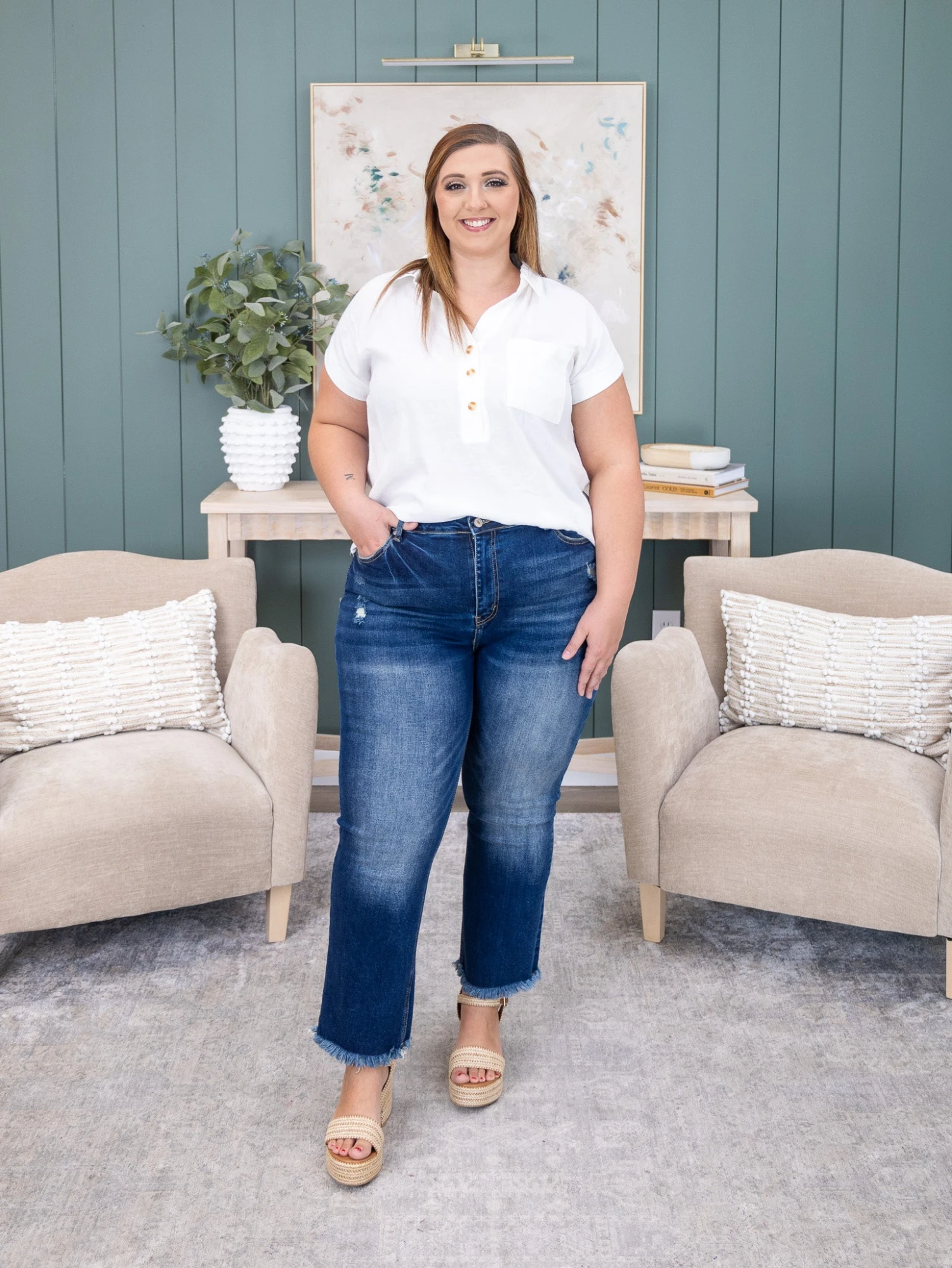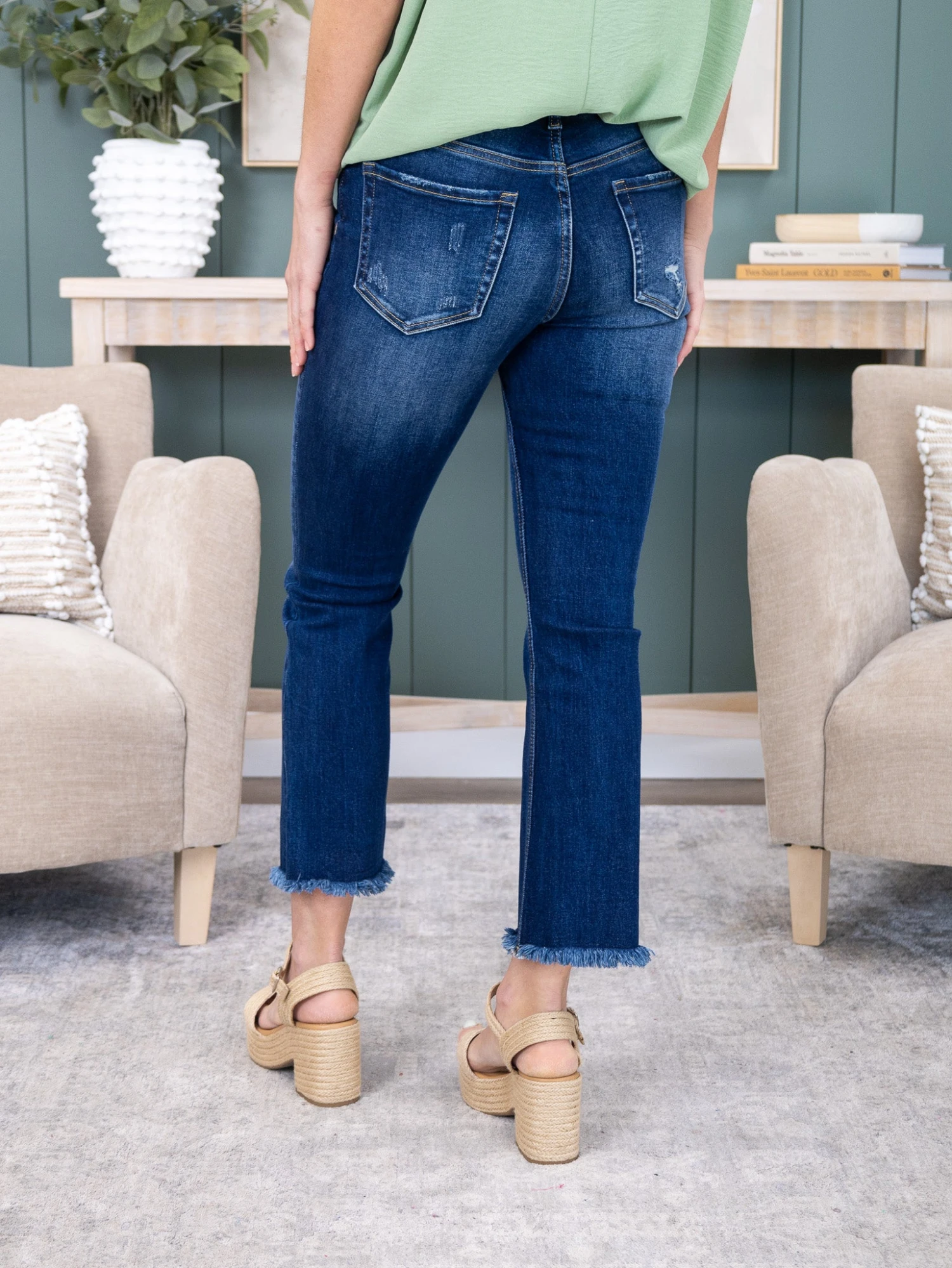 Features: High Rise, Distressing, Raw Hem, Straight Dark Wash Cropped Jeans